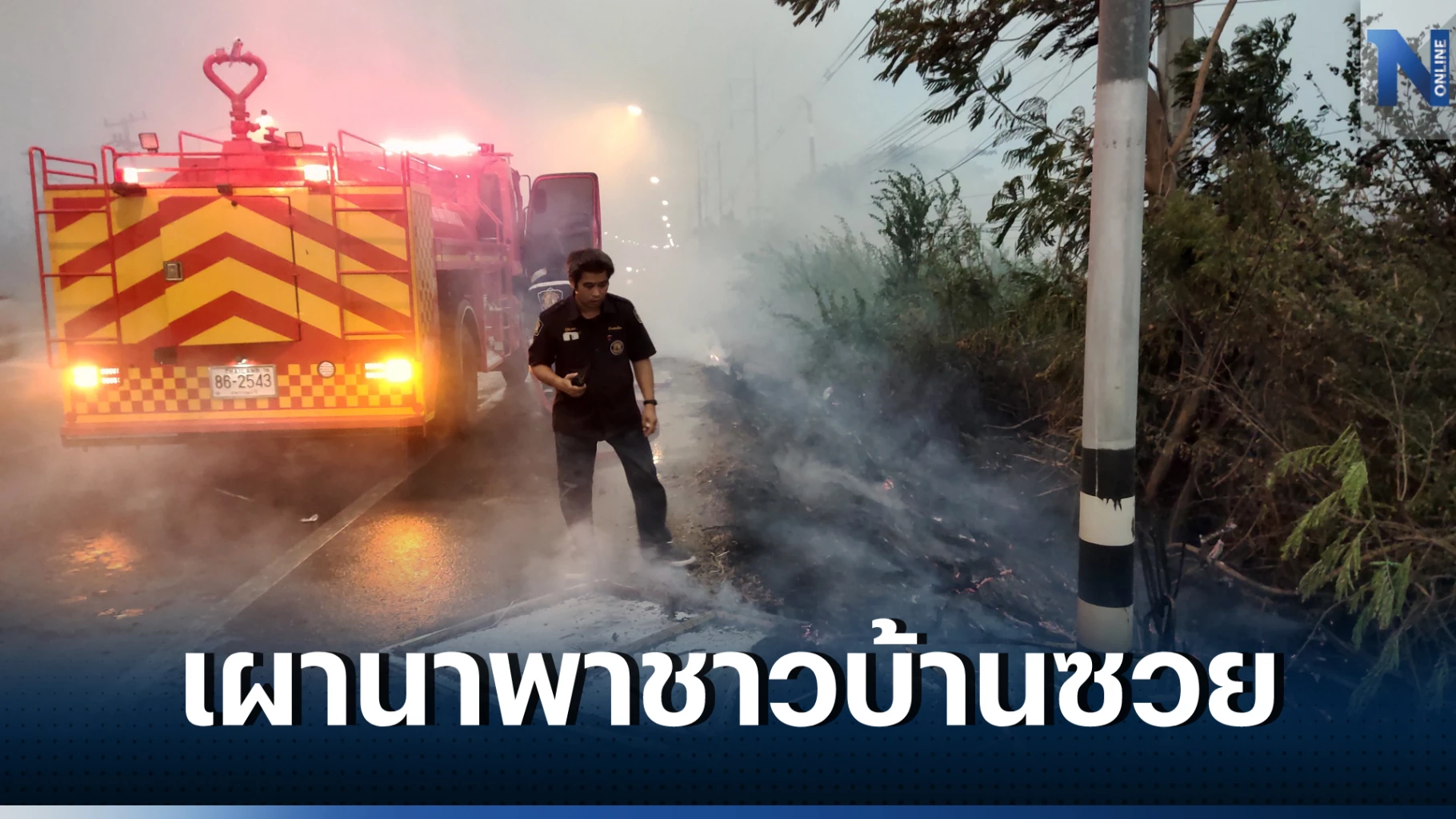 ที่เกิดเหตุ พบไฟกำลังโหมลุกไหม้หญ้าข้างทาง ยาวเกือบ 1 กิโลเมตร มีควันไฟลอยปกคลุมทั่วถนน และยังข้ามไปเข้าบ้านเรือนประชาชน ที่อยู่ในละแวกใกล้เคียง เจ้าหน้าที่จึงระดมฉีดน้ำดับไฟไม่ให้ลุกลาม ใช้เวลาประมาณ 30 นาที จึงควบคุมเพลิงข้างทาง ไม่ให้ลุกลามได้ แต่ที่ทุ่งนาติดกันพบว่า มีไฟกำลังลุกไหม้ฟางข้าวในนา เป็นวงกว้างกว่า 20 ไร่