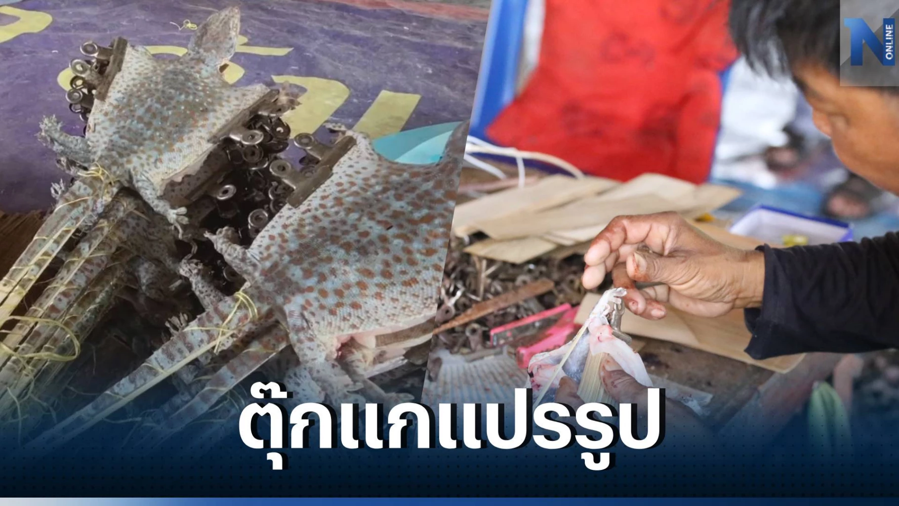 นายไสว อายุ 55 ปี ชาวบ้านตาลใหญ่ ต.นาหว้า ประกอบอาชีพแปรรูปตุ๊กแกส่งขาย เปิดเผยว่า ตุ๊กแกที่รับซื้อสดจะนำมาแปรรูป เริ่มจากการชำแหละเอาเครื่องในออก ส่วนอื่นยังต้องอยู่ครบ รวมถึงหางจะต้องไม่ขาด จากนั้นจะช่วยกันในครอบครัวทำคนละหน้าที่ เช่น แปรรูปคนหนึ่ง อีกคนจะนำตุ๊กแกมาขึงใส่ไม้แบบตามขนาด โดยจะมีการวัดขนาดความกว้าง ส่วนใหญ่จะมีขนาดตัวละ 12 -15 เซนติเมตร จากนั้นจะใช้เหล็กหนีบขึงให้หนังตุ๊กแกตึง ขึงขาทั้ง 4 ข้างออก รวมถึงมัดหางใส่ไม้เป็นก้านยาว ก่อนที่จะนำไปอบรมควันประมาณ 1 คืน ให้แห้งไม่ให้เกิดปัญหาเน่าเสียเวลาแพ็กส่งไปขาย ถือว่าสร้างงานสร้างรายได้ให้กับครอบครัว