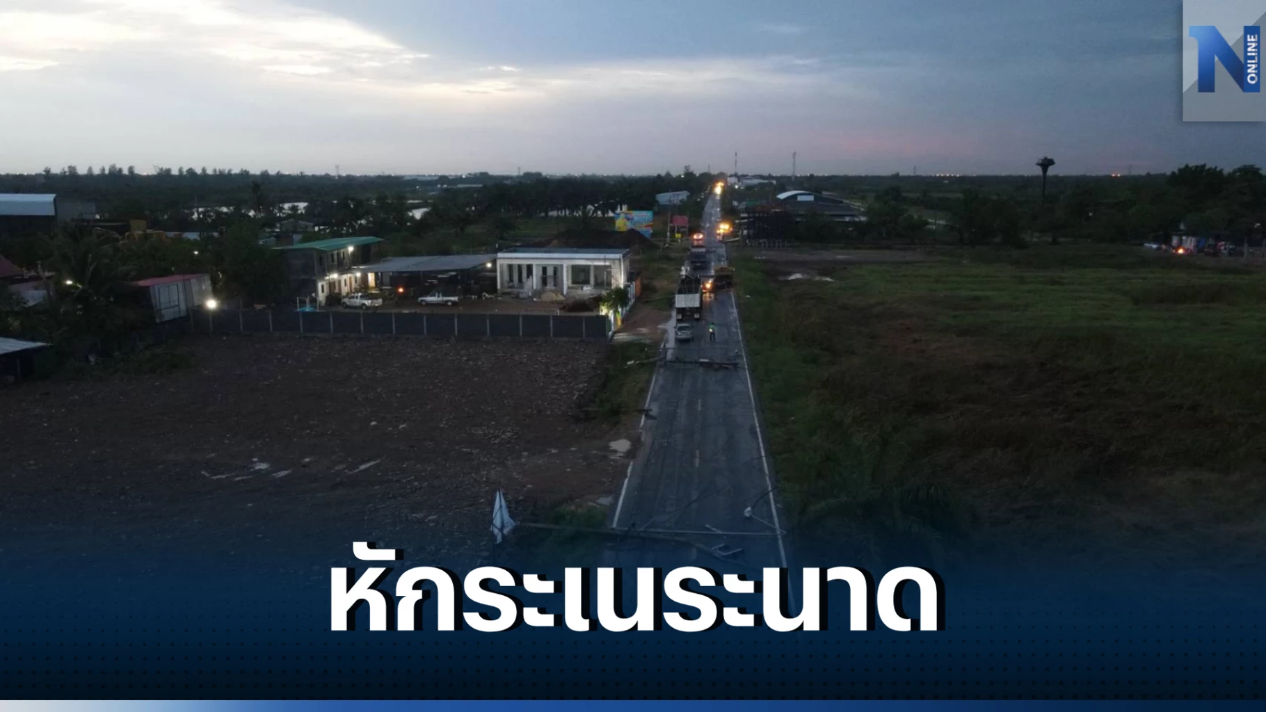 จุดเกิดเหตุถนนบางขัน - หนองเสือ ช่วงคลองแปด มุ่งหน้าคลองเก้า ม.4 ต.บึงชำอ้อ อ.หนองเสือ หลังรับแจ้งจึงรุดไปตรวจสอบ ที่เกิดเหตุพบร้านกลิ่นฟาง ซึ่งเป็นร้านจำหน่ายพันธุ์ไม้และฟาง ปุ๋ย ยา พบเสาไฟฟ้าโค่นใส่ต้นไม้ และรถยนต์นั่งส่วนบุคคล ยี่ห้อฮอนด้ารุ่นซีวิคสีดำ ของเจ้าของร้าน ได้รับความเสียหายทั้งคัน หลังคาร้านเป็นกระเบื้อง ถูกลมพัดปลิวไปจำนวนมาก