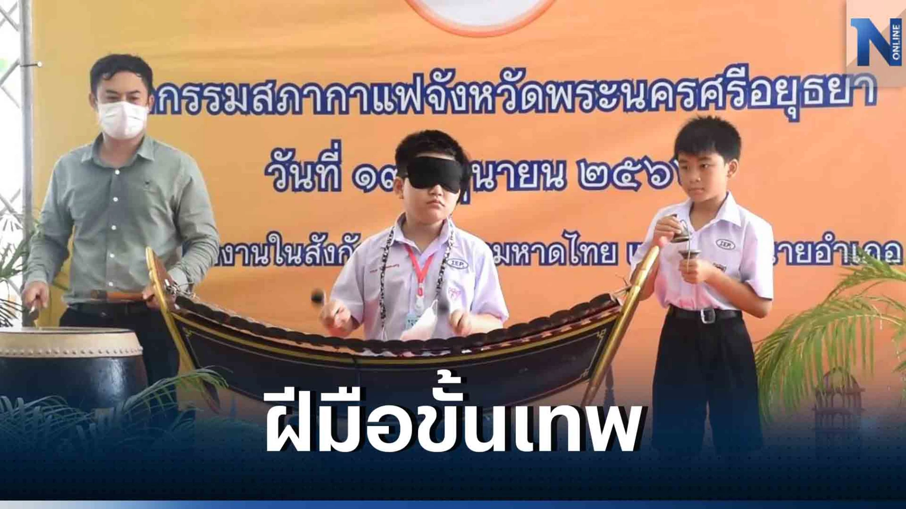 "น้องปันปัน" นักเรียนชั้น ป.5 โรงเรียนจิระศาสตร์วิทยา โชว์ฝีมือปิดตาตีระนาดเอก ในงานสภากาแฟ จ.พระนครศรีอยุธยา เรียกเสียงฮือฮาจากผู้เข้าร่วมงานได้เป็นอย่างมาก