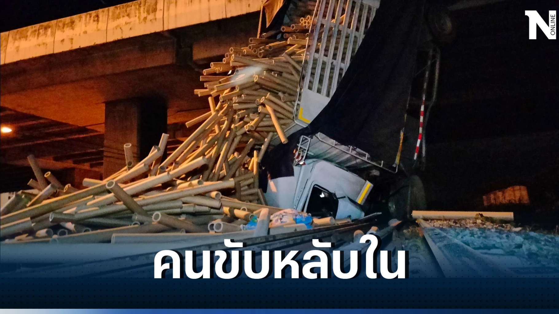 ตัวรถพุ่งชนเข้ากับป้ายบอกทางแยกวงกลมสีฟ้า ผ่าลงมาระหว่างกึ่งกลางของง่ามในท่าหัวปักลงมายังพื้น ซึ่งเป็นรางรถไฟด้านล่างที่ความสูงประมาณ 12 เมตร จนทำให้ม้วนโรลกระดาษที่บรรทุกมาที่ด้านท้ายกระบะปลิวกระเด็นกระจัดกระจายอยู่เกลื่อนพื้น ขวางรางรถไฟรวมทั้งหมดจำนวน 3 ช่องทางเดินรถจากทั้งหมด 4 ช่องทาง