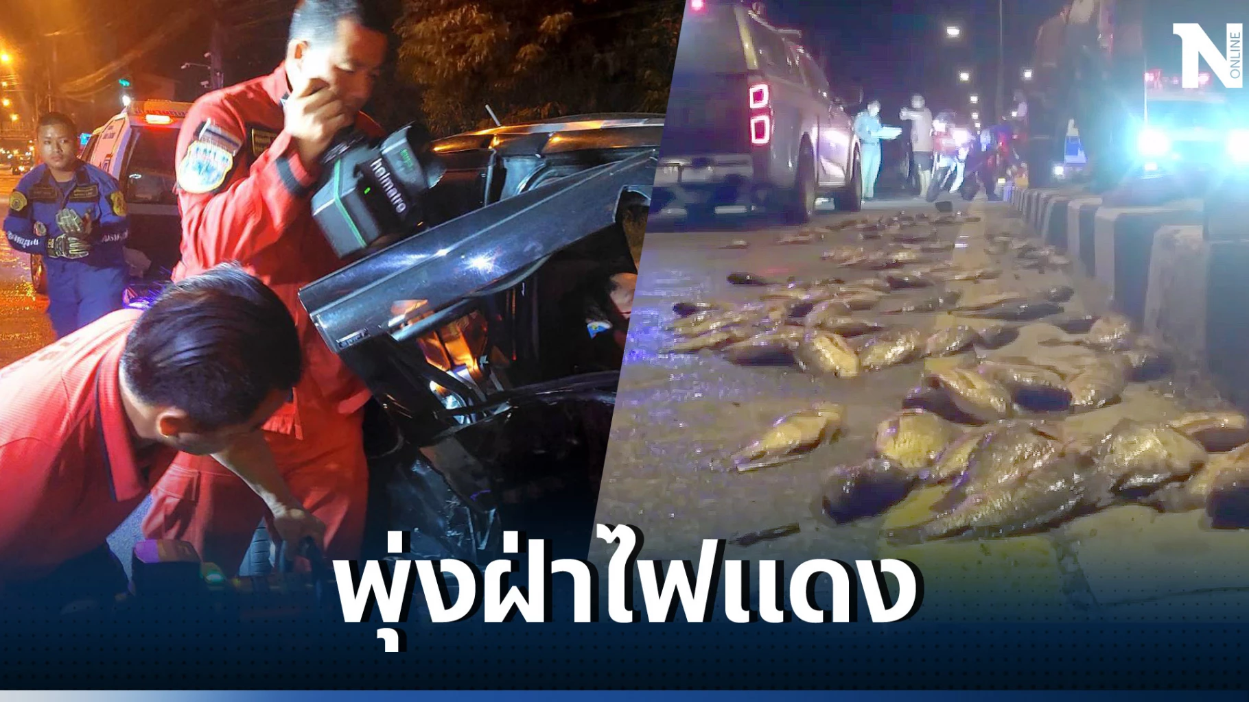 ห่างไปอีก 100เมตร พบรถยนต์กระบะ มีร่องรอยด้านหน้ารถพังเสียหาย กระจกด้านท้ายแตก ปลานิลตกกระจายเต็มพื้นถนน จอดอยู่อีกฝั่งของถนน ท้ายรถบรรทุกปลาสดมาเต็มคัน