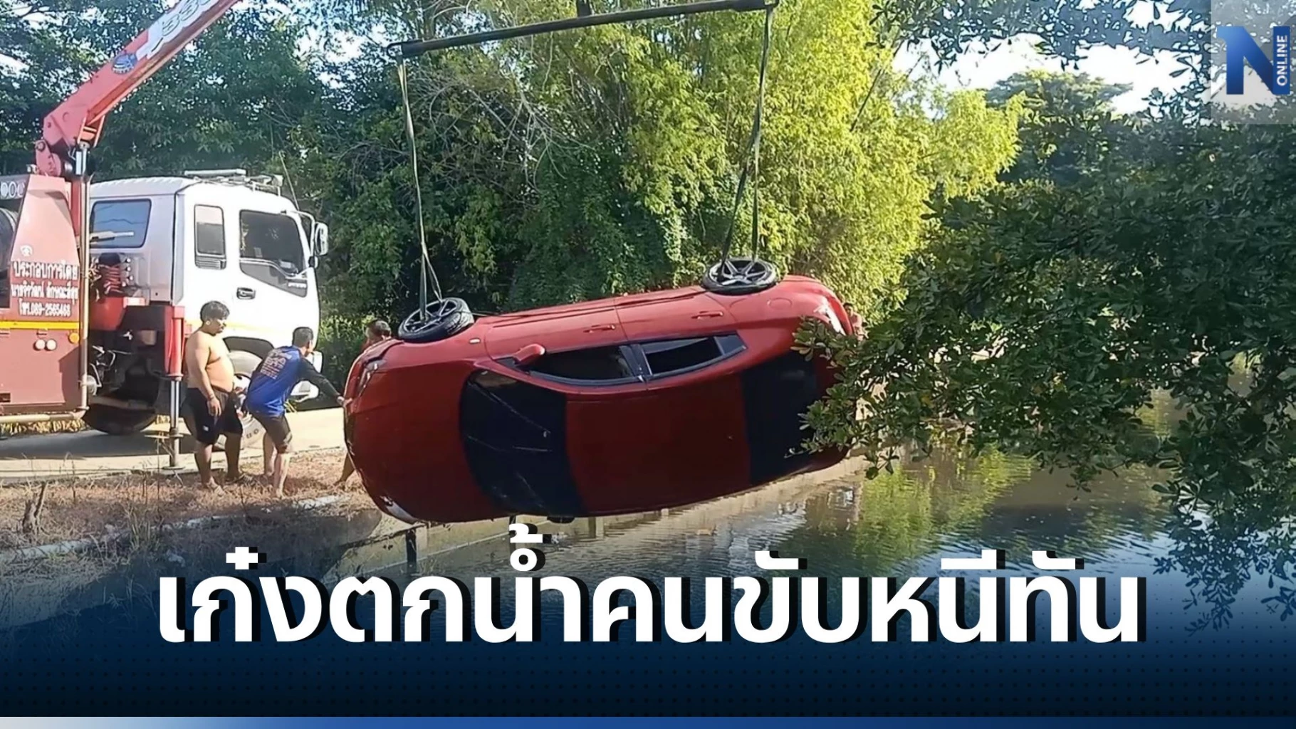 หนุ่มซิ่งเก๋งพุ่งตกน้ำจมมิดคันคนขับเปิดกระจกหนีตายออกมาได้หวุดหวิด