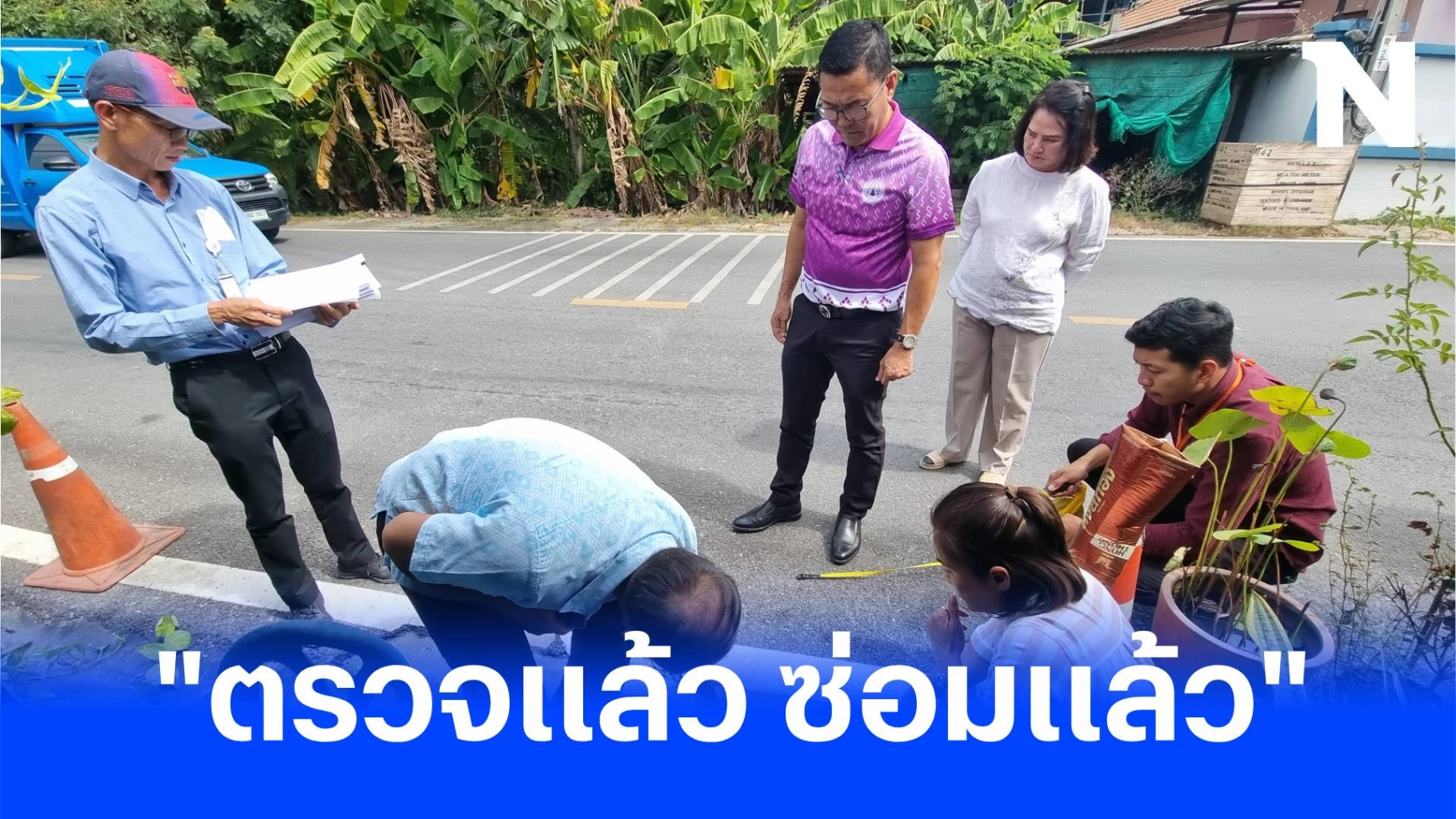 ต่อมานายประถมการ อ่วมอ่อง นายกเทศมนตรีตำบลบ้านบางม่วง พร้อมทีมวิศวกรเทศบาลตำบลได้พาผู้สื่อข่าวลงพื้นที่ภายในซอยวัดสังวรพิมลไพบูลย์ เพื่อร่วมกันตรวจสอบถนนที่ถูกร้องเรียน ซึ่งระยะทาง 1,013 เมตร โดยพบว่าบริเวณริมถนนส่วนใหญ่ยางแอสฟัลท์ จะมีความหนาแตกต่างกัน ตั้งแต่ 5 ซม.ถึง 15 ซม. ส่วนจุดที่ถูกชาวบ้านร้องเรียนนั้นพบว่าเป็นบริเวณหน้าร้านอาหารห่างจากปากซอยประมาณ 50 เมตร ถูกชาวบ้านนำกระถางต้นไม้และกรวยจราจรมาตั้งพื้นที่ไหล่ทางระยะทางประมาณ 15 เมตร โดยพบผิวที่ลาดยางแตกหลุดร่อนประมาณ 1 เมตร โดยรอยแตกมีความหนาของแผ่นยางแอสฟัลท์ ตั้งแต่ 2.5 ซม.ถึง 3 ซม.เนื่องจากผิวถนนคอนกรีตเดิมมีระดับความสูงจากจุดอื่น การลาดยางแอสฟัลท์จึงบางลง เพื่อให้ผิวจราจรถูกปรับปรุงให้อยู่ในแนวระนาบเดียวกันไม่กลายเป็นลูกคลื่น ทางเจ้าหน้าที่กองช่างทำการวัดระยะที่จะทำการซ่อมแซม เพื่อเสริมยางแอสฟัลท์ให้สูงถึง 5 ซม.รวมเป็นระยะความยาวประมาณ 3 เมตร เพื่อป้องกันการเกิดลูกคลื่นหรือหลังเต่าเพราะจะทำให้เกิดอุบัติเหตุกับผู้ใช้ถนนตามมาได้
