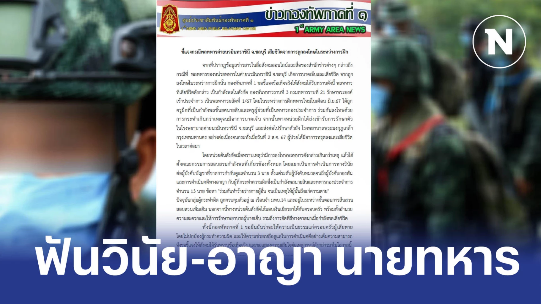 15 สิงหาคม 2567 ล่าสุด ศูนย์ประชาสัมพันธ์ กองทัพภาคที่ 1 ชี้แจงกรณีพลทหารค่ายนวมินทราชินี จ.ชลบุรี เสียชีวิตจากการถูกลงโทษในระหว่างการฝึก ระบุว่า