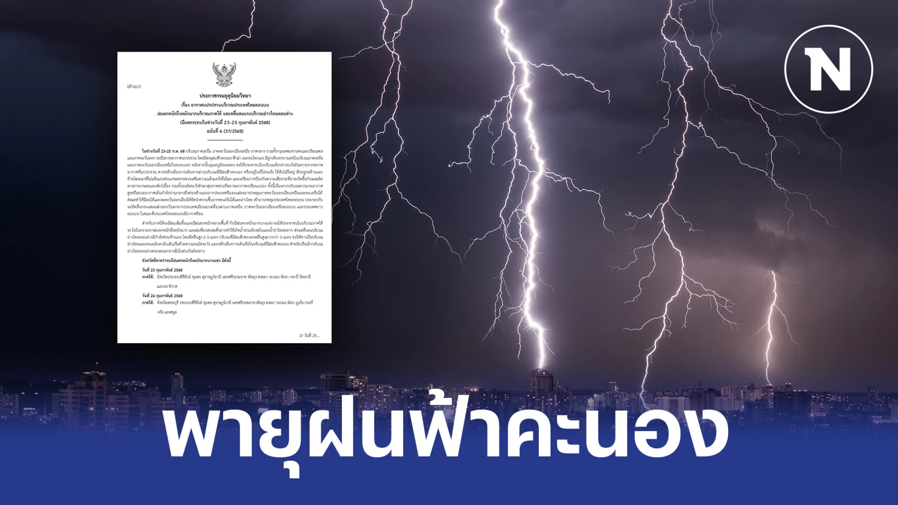 22 กุมภาพันธ์ 2568 พยากรณ์อากาศ กรมอุตุนิยมวิทยา ออกประกาศเตือน "พายุฝนฟ้าคะนอง" แจ้งพื้นที่ ฝนตกหนักถึงหนักมาก ลงกระโชกแรง และลูกเห็บตก โดย นางสาวสุกันยาณี ยะวิญชาญ อธิบดีกรมอุตุนิยมวิทยา ลงนามในประกาศกรมอุตุนิยมวิทยา ฉบับที่ 6 (37/2568) เรื่อง อากาศแปรปรวนบริเวณประเทศไทยตอนบน ฝนตกหนักถึงหนักมากบริเวณภาคใต้ และคลื่นลมแรงบริเวณอ่าวไทยตอนล่าง มีผลกระทบในช่วงวันที่ 23-25 กุมภาพันธ์ 2568