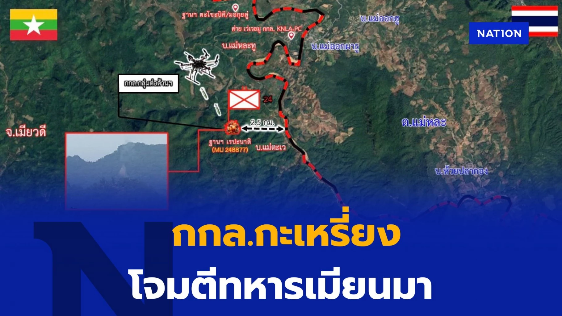 7 พฤษภาคม 2568 รายงานข่าวจากกองกำลังราชมนู เปิดเผยว่า กองทัพปลดปล่อยชาติกะเหรี่ยง (กกล.KNLA) ร่วมกับ องค์การป้องกันชาติกะเหรี่ยง (กกล.KNDO) ได้นำกำลังเข้าประชิดปิดล้อม และใช้อากาศยานไร้คนขับ หรือ โดรน โจมตีทิ้งระเบิดอย่างต่อเนื่องตลอดทั้งวัน ต่อที่ตั้งทหารเมียนมา ฐานเรปะนาดิ (พัน.ร.24 ) อ.แลงปอย จ.ผาอัน รัฐกะเหรี่ยง สหภาพเมียนมา ด้านตรงข้าม บ.แม่ออกผารู ม.3 ต.แม่หละ อ.ท่าสองยาง จ.ตาก ชายแดนไทย-เมียนมา โดยห่างจากแนวชายแดนประมาณ 2.5 กิโลเมตร