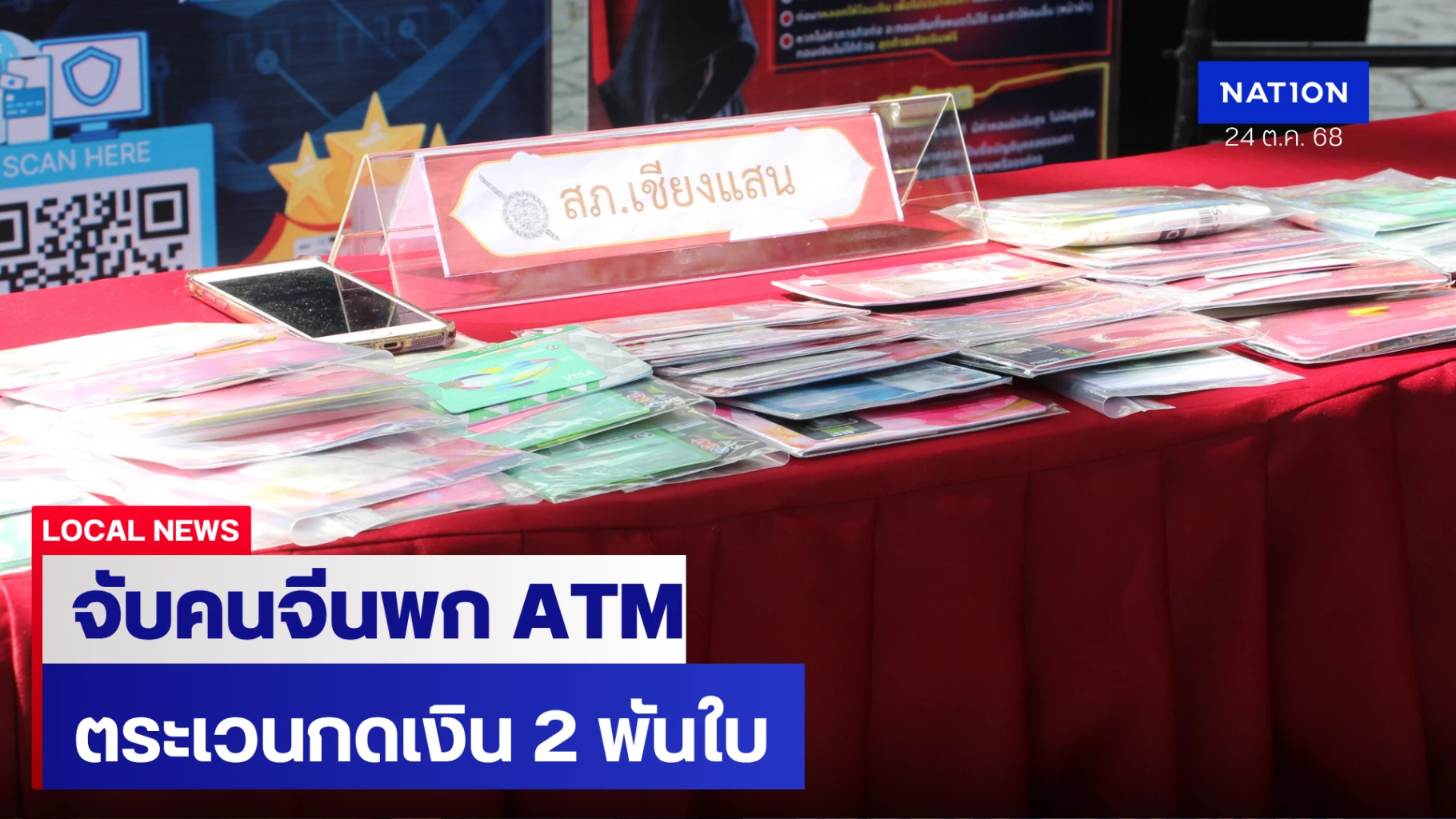 24 ตุลาคม 2568 ที่ จ.เชียงราย พลตำรวจตรีมานพ เสนากูล ผู้บังคับการตำรวจภูธรจังหวัดเชียงราย พร้อมตำรวจ สภ.เมืองเชียงราย ตำรวจท่องเที่ยวเชียงราย เจ้าหน้าที่ตรวจคนเข้าเมืองเชียงราย และเจ้าหน้าที่ที่เกี่ยวข้อง ร่วมกันแถลงข่าวการจับกุม Mr.HU HAOJIE ชาวจีน อายุ 35 ปี ที่อยู่ มณฑลหูเป่ย์ สัญชาติจีน ประเทศจีน พร้อมของกลาง โทรศัพท์มือถือถือ ยี่ห้อ ไอโฟน รุ่น 14 สีน้ำเงิน จำนวน 1 เครื่อง โทรศัพท์มือถือ ยี่ห้อ วีโว่ สีฟ้า จำนวน 1 เครื่อง โน้ตบุ๊กสีเงิน ยี่ห้อ Lenovo รหัสเครื่อง DESKTOP-20B1900 จำนวน 1 เครื่อง บัตร ATM จำนวน 2,057 ใบ เงินสดทั้งหมดจำนวน 537,900 บาท รวมถึงของกลางรายการอื่น ๆ และอีกราย สภ.เชียงแสน แถลงจับกุม นายรุ่งโรจน์ สงวนนามสกุล อายุ 35 ปี ราษฎร อ.แม่ฟ้าหลวง จ.เชียงราย พร้อมของกลาง สมุดบัญชีธนาคาร จำนวน 34 เล่ม บัตรเอทีเอ็ม จำนวน 38 ใบ ซิมการ์ดจำนวน 39 ซิม