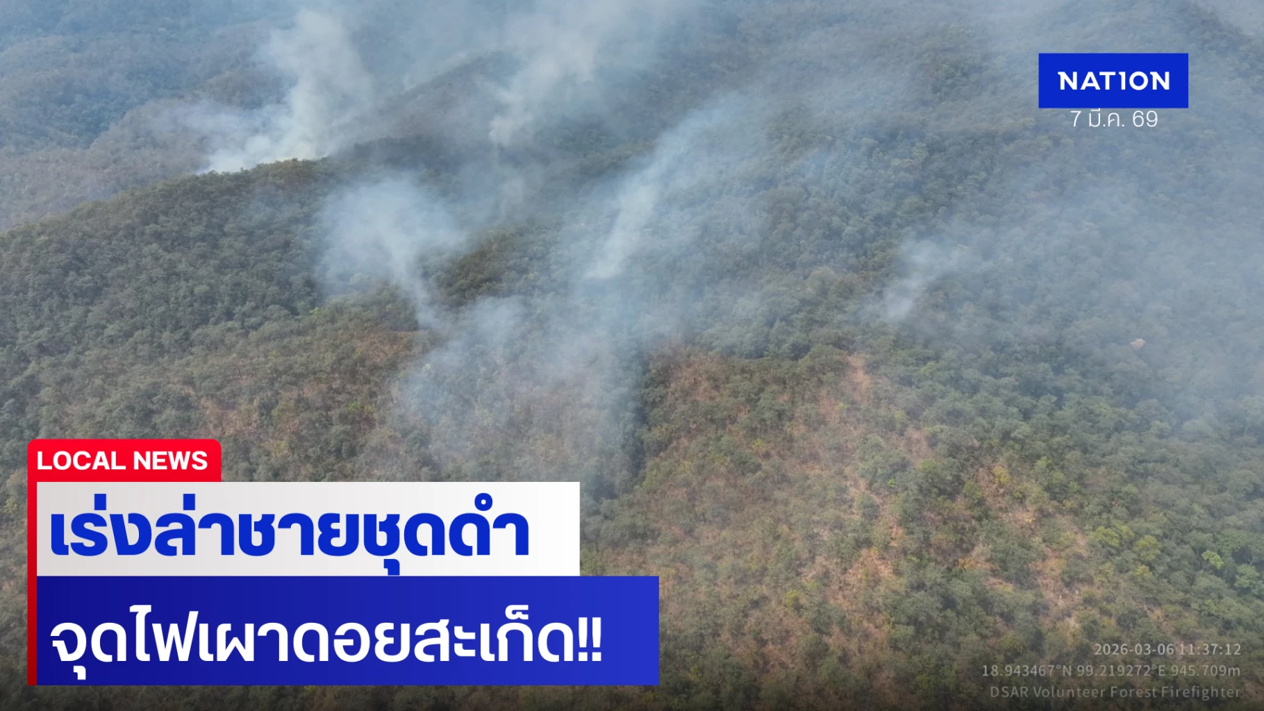 7 มีนาคม 2569 สถานการณ์ไฟป่าในพื้นที่อำเภอดอยสะเก็ด จังหวัดเชียงใหม่ ยังคงน่าเป็นห่วง หลังเจ้าหน้าที่หลายหน่วยงาน ต้องเร่งเข้าควบคุมเพลิงที่ลุกลามในเขตป่าสงวนแห่งชาติ ขณะเดียวกันพบหลักฐานสำคัญจากโดรนของจิตอาสาดับไฟป่าภาคประชาชน ที่สามารถบันทึกภาพชายต้องสงสัยสวมชุดดำ ขณะกำลังจุดไฟเผาป่าได้อย่างชัดเจน