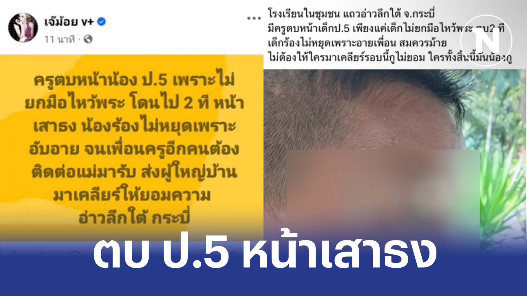 “ครูตบหน้าน้อง ป.5 เพราะไม่ยกมือไหว้พระ โดนไป 2 ที หน้าเสาธงน้องร้องไม่หยุดเพราะอับอาย จนเพื่อนครูอีกคนต้องติดต่อแม่มารับ ส่งผู้ใหญ่บ้านมาเคลียให้ยอมความ อ่าวลึกใต้กระบี่”