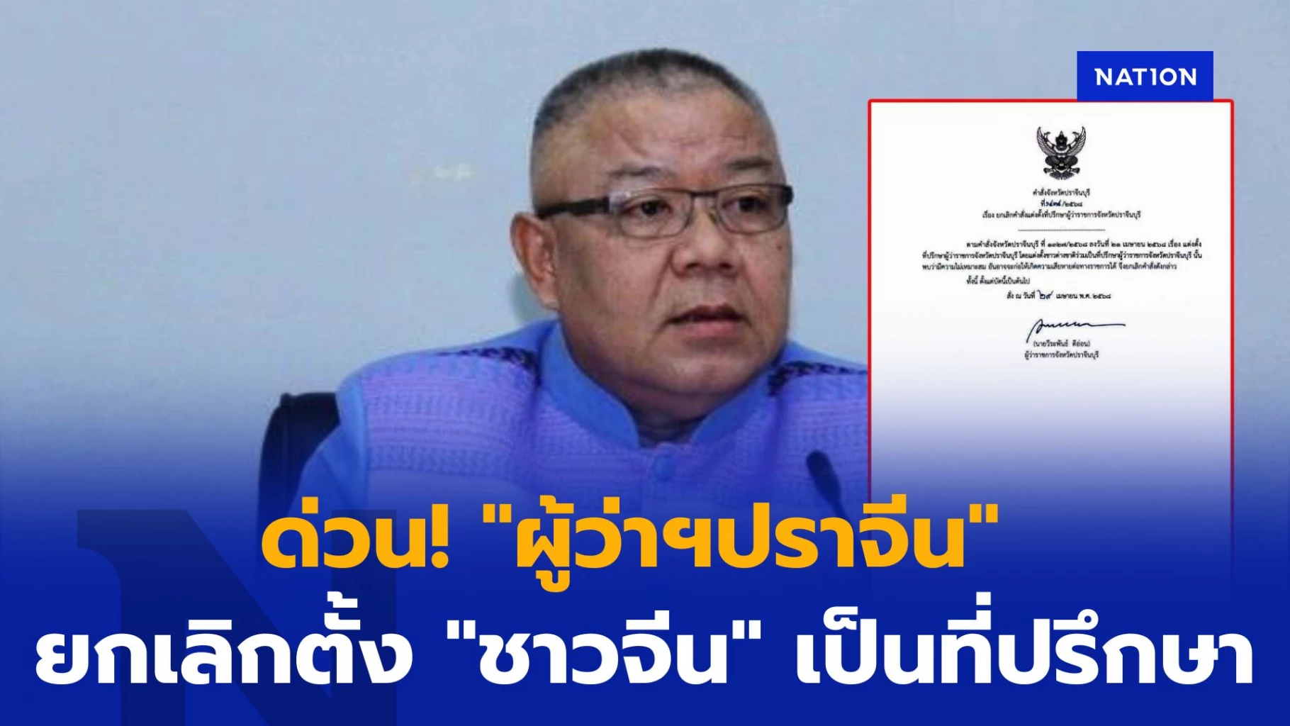 ระบุว่า ตามคำสั่งจังหวัดปราจีนบุรี ที่ 1327/2568 ลงวันที่ 21 เมษายน 2568 เรื่อง แต่งตั้งที่ปรึกษาผู้ว่าราชการจังหวัดปราจีนบุรี โดยแต่งตั้งชาวต่างชาติร่วมเป็นที่ปรึกษาผู้ว่าราชการจังหวัดปราจีนบุรีนั้น พบว่ามีความไม่เหมาะสม อันอาจจะก่อให้เกิดความเสียหายทางราชการได้ จึงยกเลิกคำสั่งดังกล่าว