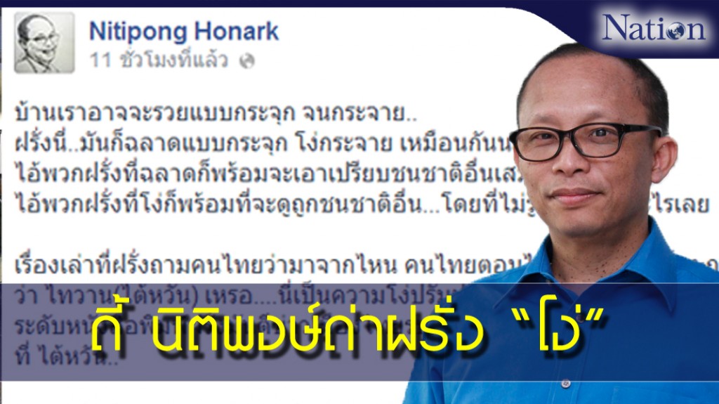 ดี้ นิติพงษ์ ห่อนาค อดีตสมาชิกวงเฉลียง และนักแต่งเพลงชั้นแนวหน้าของไทย และผู้บริหารค่ายสหภาพดนตรี โพสต์เฟสบุ๊ค ผ่าน @Nitipong Honark ต่อว่าต่างชาติ ที่พร้อมจะดูถูกคนชาติอื่น โดยมีข้อความระบุว่า