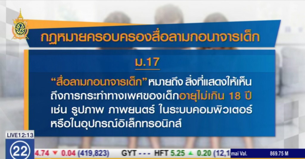 พ.ร.บ.แก้ไขเพิ่มเติม ประมวลกฏหมายอาญา ว่าด้วยความผิดเกี่ยวกับการครอบครองสื่อลามกอนาจารเด็ก ที่ประกาศใช้ผ่านราชกิจานุเบกษาเมื่อเดือนกันยายนปี 2558 ให้ความหมายของ "สื่อลามกอนาจารเด็ก" ว่า หมายถึง สิ่งที่แสดงให้เห็นถึงการกระทำทางเพศของเด็ก ที่อายุไม่เกิน 18 ปี ทั้งในรูปแบบของรูปถ่าย ภาพยนตร์