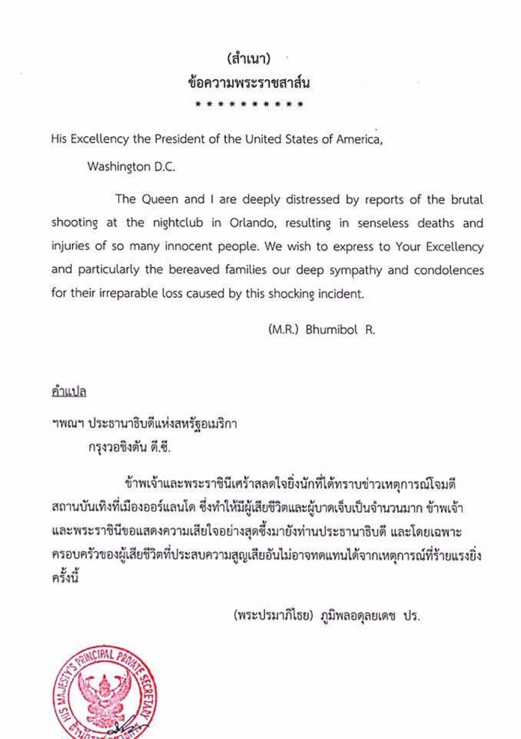 เมื่อวันที่13 มิ.ย. พระบาทสมเด็จพระเจ้าอยู่หัวและสมเด็จพระนางเจ้าฯ พระบรมราชินีนาถ ทรงพระกรุณาโปรดเกล้าฯ ให้มีข้อความพระราชสาส์นแสดงความเสียพระราชหฤทัย ไปยังประธานาธิบดีแห่งสหรัฐอเมริกา กรณีเหตุการณ์โจมตีสถานบันเทิงที่เมืองออร์แลนโด รัฐฟลอริดา สหรัฐอเมริกา เมื่อวันที่ 12 มิ.ย. 2559 ความว่า