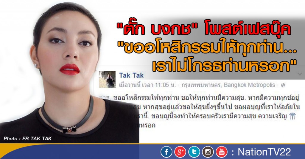 "ตั๊ก" บงกช คงมาลัย ดาราชื่อดัง และภรรยาของนายบุญชัย เบญจรงคกุล หรือเจ้าสัวบุญชัย ประธานบริหารบริษัทดีแทค ได้โพสต์ข้อความผ่านทางเฟสบุ๊คของตนเอง "Tak Tak" เมื่อวานนี้ ระบุว่า สาธุ. ขออโหสิกรรมให้ทุกท่าน ขอให้ทุกท่านมีความสุข. หากมีความทุกข์อยู่ขอให้มีความสุข หากสุขอยู่เเล้วขอให้สุขยิ่งๆขึ้นไป ขอผลบุญที่เราให้อภัยในความกล่าวด่าเรานี้ ขอบุญนี้จงทำให้ครอบครัวเรามีความสุข ความเจริญ เราไม่โกรธท่านหรอก