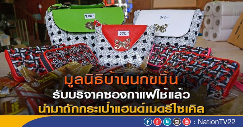 มูลนิธิบ้านนกขมิ้น รับบริจาคซองกาแฟใช้แล้ว นำมาถักกระเป๋าแฮนด์เมดรีไซเคิล