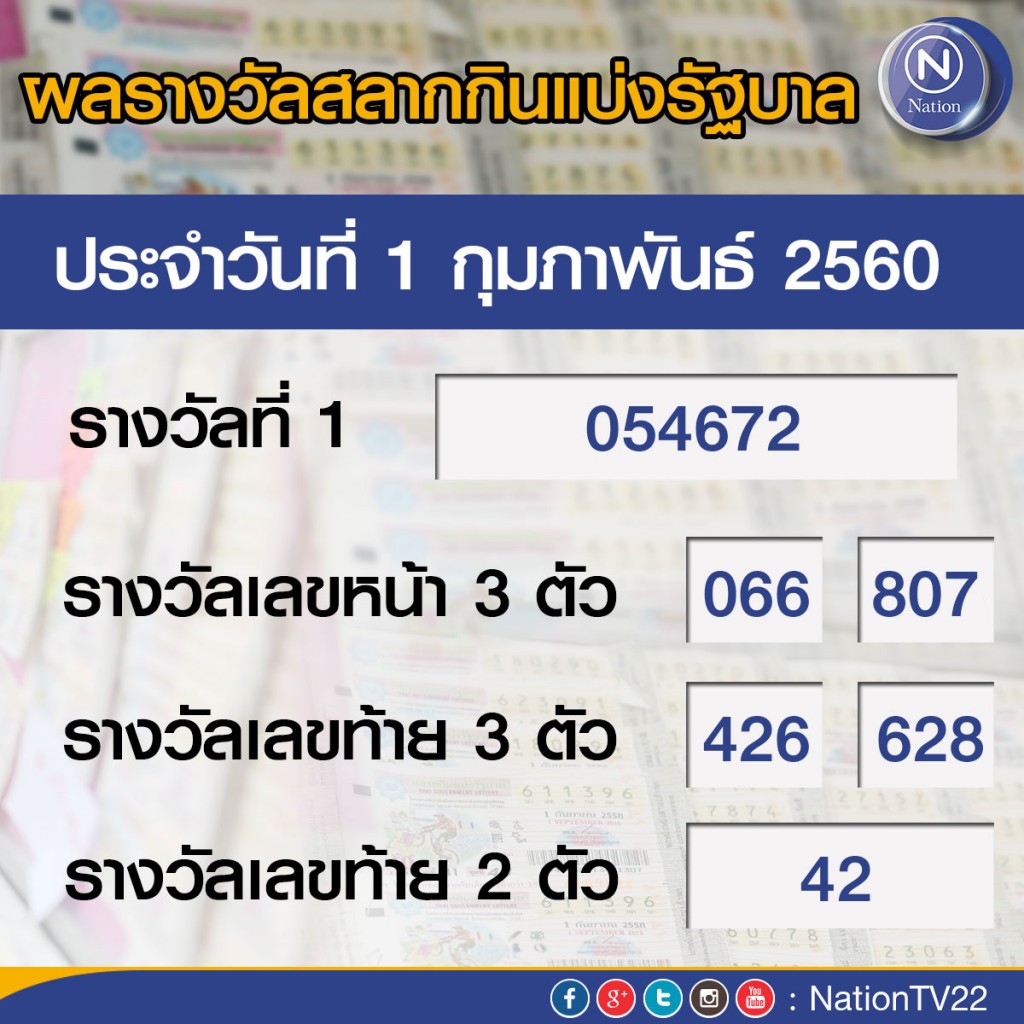 ผลสลากกินแบ่งรัฐบาล งวดประจำวันที่ 1 กุมภาพันธ์ 2560 รางวัลที่ 1 : 054672 / รางวัลเลขหน้า 3 ตัว : 066 807 / รางวัลเลขท้าย 3 ตัว : 426 628 / รางวัลเลขท้าย 2 ตัว : 42