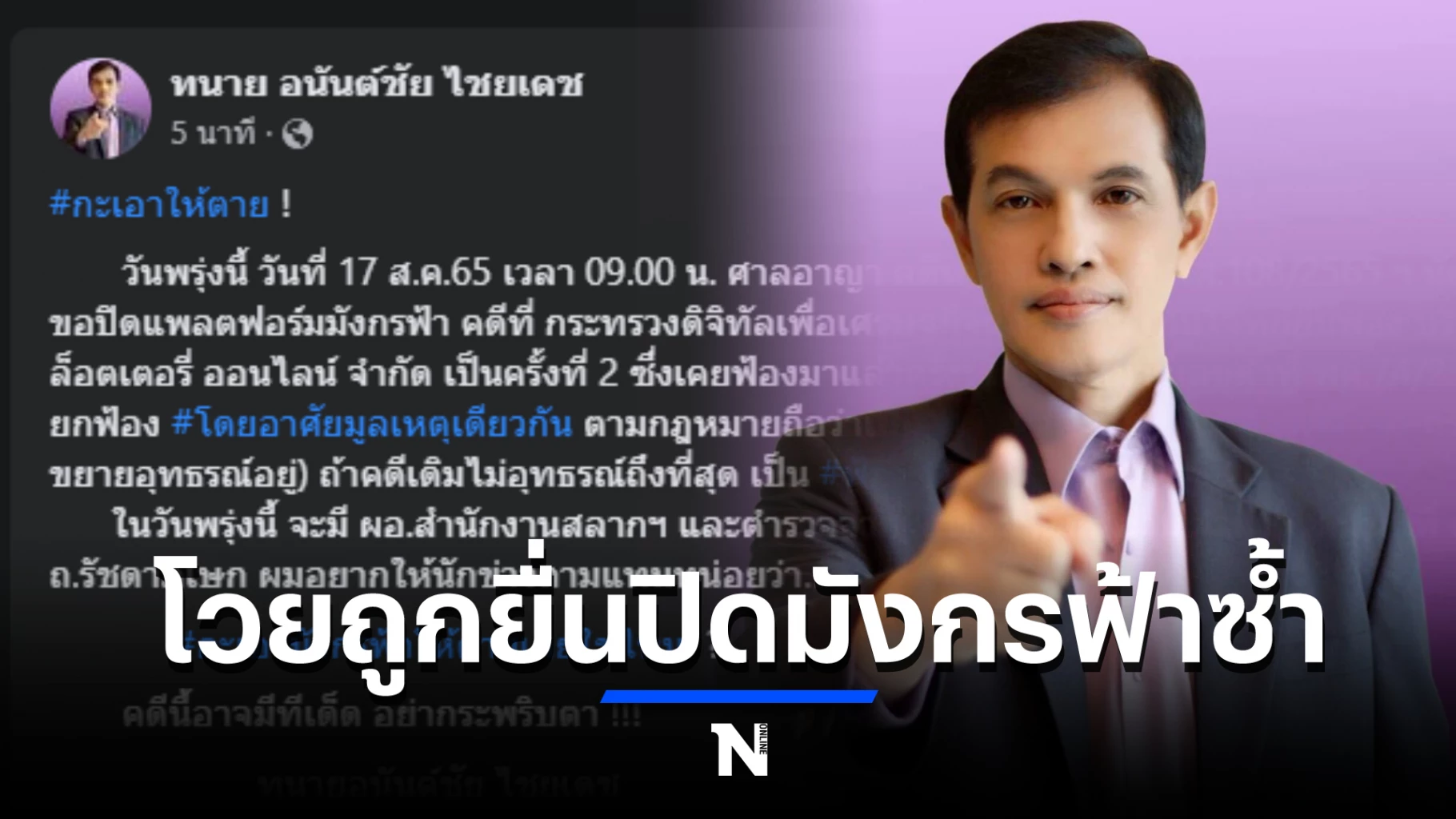 ล่าสุดวันนี้ (16 ส.ค.) ทนาย อนันต์ชัย ไชยเดช ทนายความของ นายพชรล์ เมสสิยาห์พร หรือ แทมป์ ผู้บริหารมังกรฟ้า ได้โพสต์ผ่านเฟซบุ๊กส่วนตัว วิจารณ์กรณีที่ ทางกระทรวงดิจิทัลเพื่อเศรษฐกิจและสังคม ยื่นคำร้องขอปิดแพลตฟอร์มมังกรฟ้า เป็นครั้งที่ 2 โดยระบุว่า
