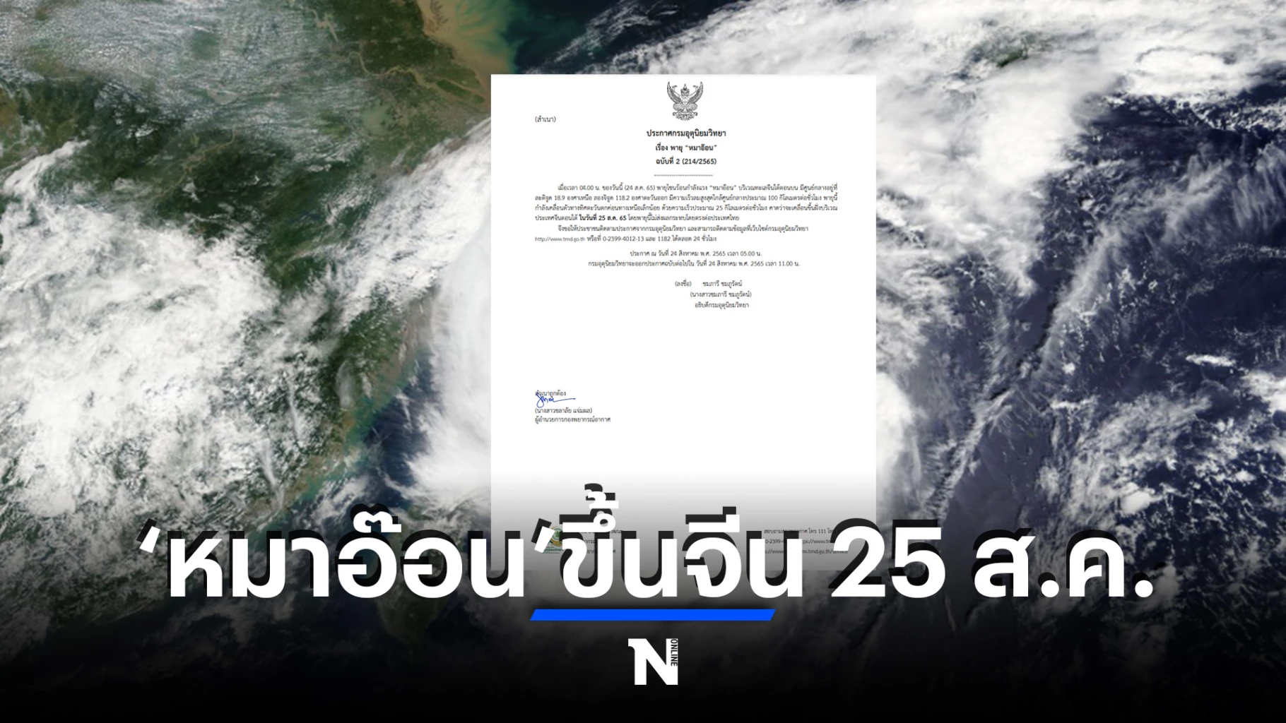 เมื่อเวลา 04.00 น. ของวันนี้ (24 ส.ค. 65) พายุโซนร้อนกำลังแรง “หมาอ๊อน” บริเวณทะเลจีนใต้ตอนบน มีศูนย์กลางอยู่ที่ละติจูด 18.9 องศาเหนือ ลองจิจูด 118.2 องศาตะวันออก มีความเร็วลมสูงสุดใกล้ศูนย์กลางประมาณ 100 กิโลเมตรต่อชั่วโมง พายุนี้กำลังเคลื่อนตัวทางทิศตะวันตกค่อนทางเหนือเล็กน้อย ด้วยความเร็วประมาณ 25 กิโลเมตรต่อชั่วโมง คาดว่าจะเคลื่อนขึ้นฝั่งบริเวณประเทศจีนตอนใต้ ในวันที่ 25 ส.ค. 65 โดยพายุนี้ไม่ส่งผลกระทบโดยตรงต่อประเทศไทย