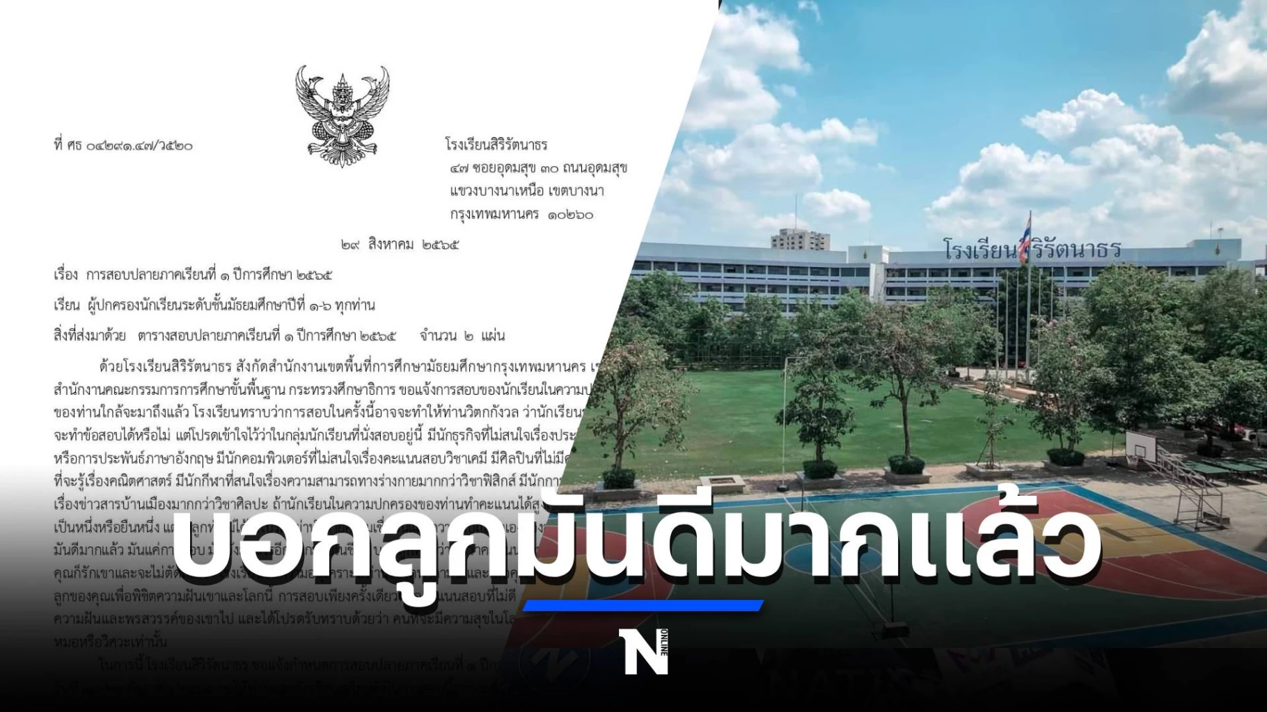รร.สิริรัตนาธรส่งจดหมายถึงผู้ปกครองขออย่ากดดันเด็กจากผลสอบ