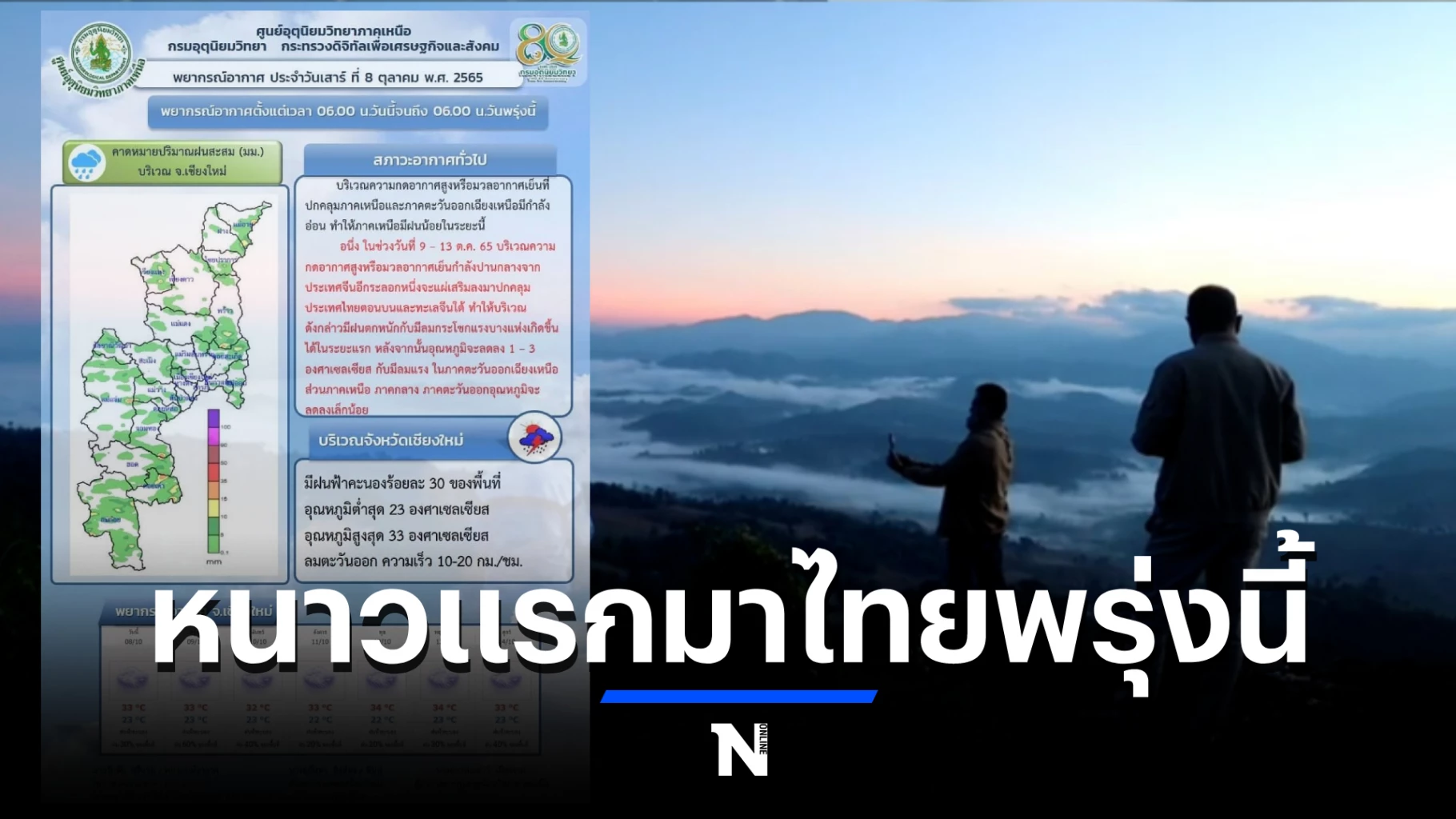 อย่างไรก็ตาม ในช่วงวันที่ 9 – 13 ต.ค. 65 บริเวณความกดอากาศสูง หรือมวลอากาศเย็นกำลังปานกลาง อีกระลอกหนึ่ง จะแผ่เสริมลงมาปกคลุมประเทศไทยตอนบนและทะเลจีนใต้ ส่งผลให้บริเวณดังกล่าวมีฝนตกหนักและลมกระโชกแรง อุณหภูมิจะลดลงหนึ่งถึงสามองศา