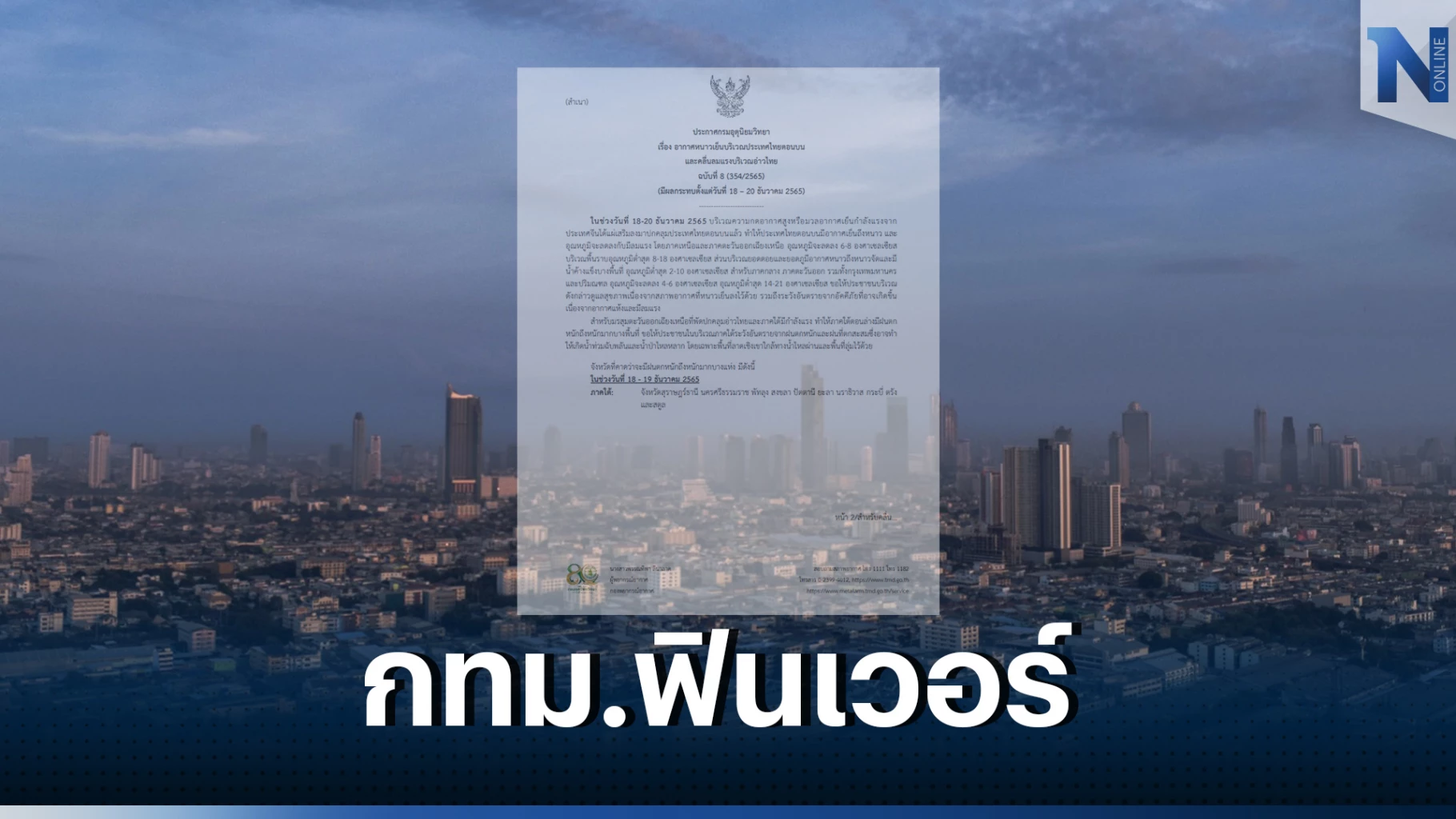 18 ธันวาคม 2565 กรมอุตุนิยมวิทยา ประกาศฉบับที่ 8 เรื่อง อากาศหนาวเย็นบริเวณประเทศไทยตอนบน และคลื่นลมแรงบริเวณอ่าวไทย มีผลกระทบตั้งแต่วันที่ 18 – 20 ธันวาคม 2565