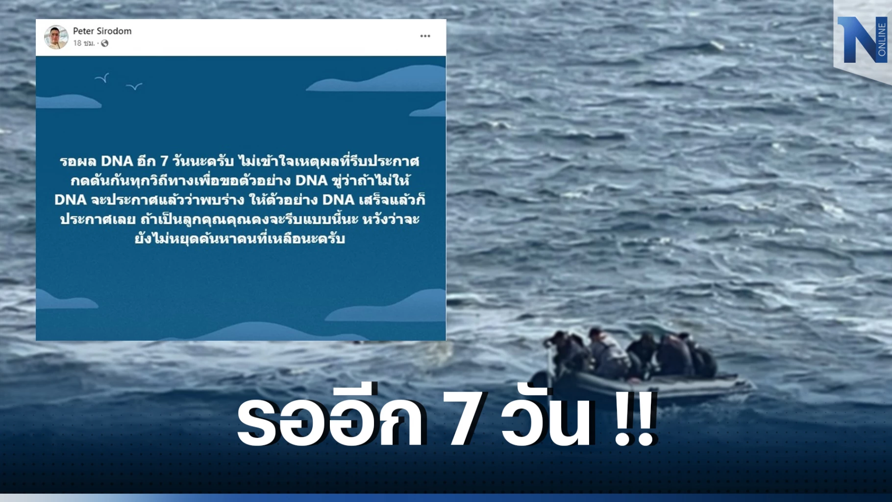 “รอผล DNA อีก 7 วันนะครับ ไม่เข้าใจเหตุผลที่รีบประกาศ กดดันกันทุกวิถีทางเพื่อขอตัวอย่าง DNA ขู่ว่าถ้าไม่ให้ DNA จะประกาศแล้วว่าพบร่าง ให้ตัวอย่าง DNA เสร็จแล้วก็ประกาศเลย ถ้าเป็นลูกคุณคุณคงจะรีบแบบนี้นะ หวังว่าจะยังไม่หยุดค้นหาคนที่เหลือนะครับ”