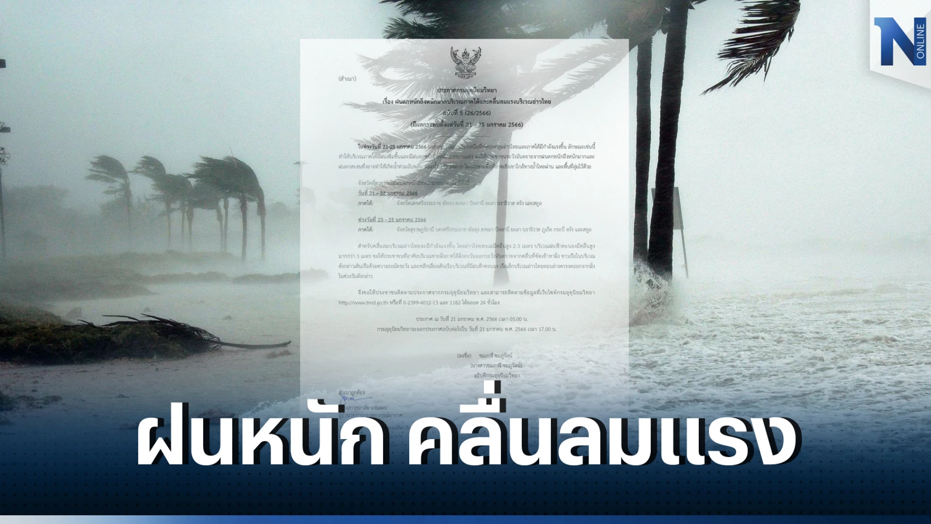 21 มกราคม 2566 นางสาวชมภารี ชมภูรัตน์ อธิบดีกรมอุตุนิยมวิทยา ประกาศกรมอุตุนิยมวิทยา ฉบับที่ 5 (26/2566) เรื่อง ฝนตกหนักถึงหนักมากบริเวณภาคใต้และคลื่นลมแรงบริเวณอ่าวไทย มีผลกระทบตั้งแต่วันที่ 21 - 25 มกราคม 2566 มีรายละเอียดดังนี้