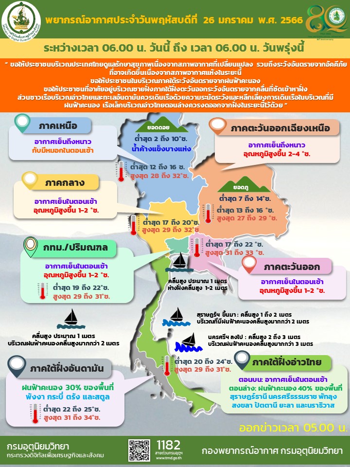 ประกาศ ณ วันที่ 26 มกราคม พ.ศ. 2566 เวลา 05.00 น. กรมอุตุนิยมวิทยาจะออกประกาศฉบับต่อไปใน วันที่ 26 มกราคม พ.ศ. 2566 เวลา 17.00 น.