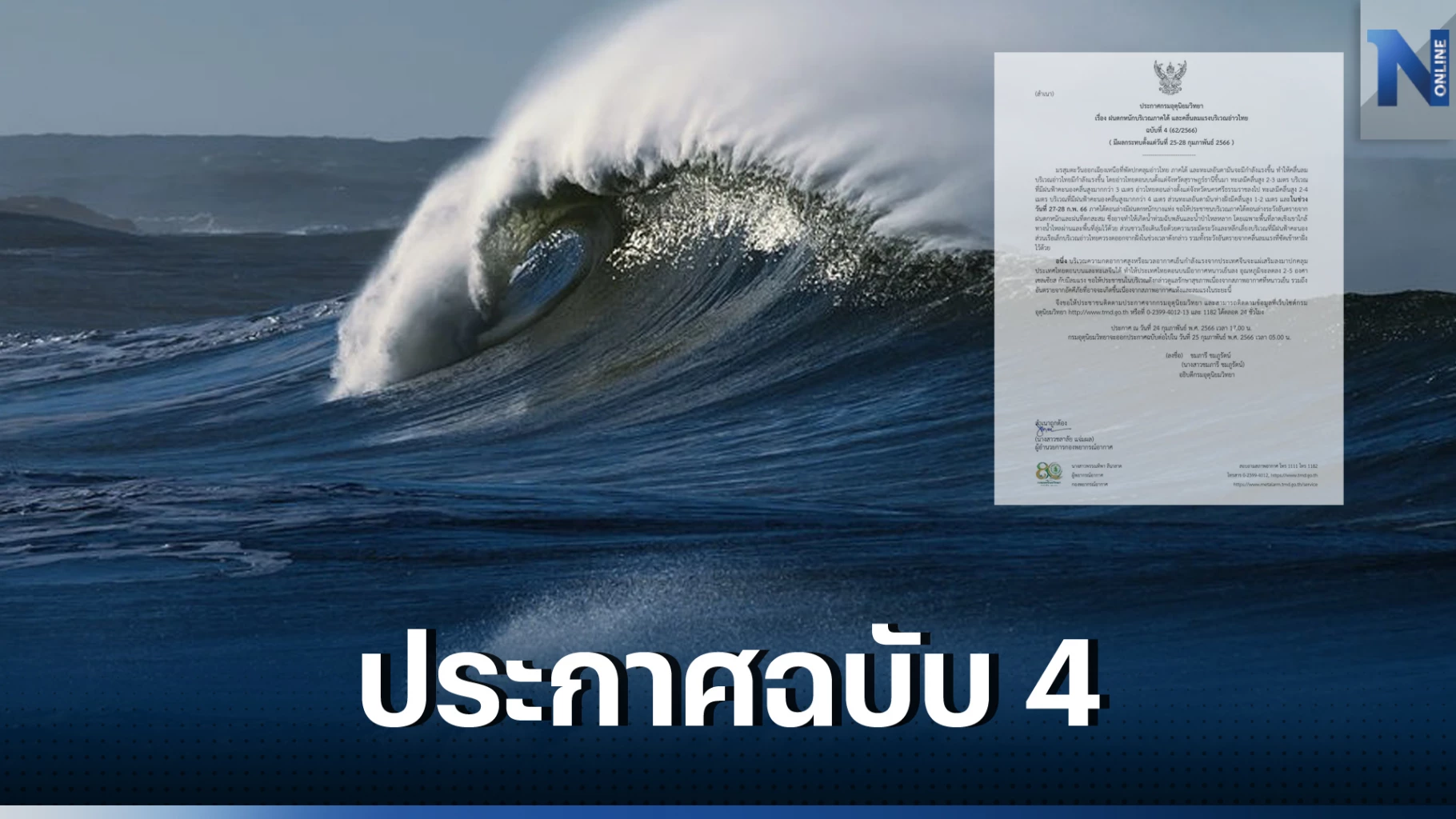 กรมอุตุนิยมวิทยา ออกประกาศกรมอุตุนิยมวิทยา ฉบับที่ 4 เรื่อง ฝนตกหนักบริเวณภาคใต้ และคลื่นลมแรงบริเวณอ่าวไทย มีผลกระทบตั้งแต่วันที่ 25-28 กุมภาพันธ์ 2566