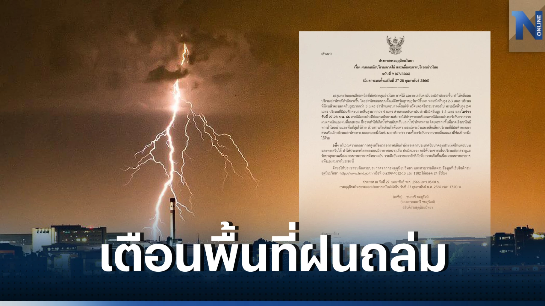กรมอุตุนิยมวิทยา ขอให้ประชาชนติดตามประกาศจากกรมอุตุนิยมวิทยา และสามารถติดตามข้อมูลที่ เว็บไซต์กรมอุตุนิยมวิทยา หรือที่ 0-2399-4012-13 และ 1182 ได้ตลอด 24 ชั่วโมง ประกาศ ณ วันที่ 27 กุมภาพันธ์ พ.ศ. 2566 เวลา 05.00 น.
