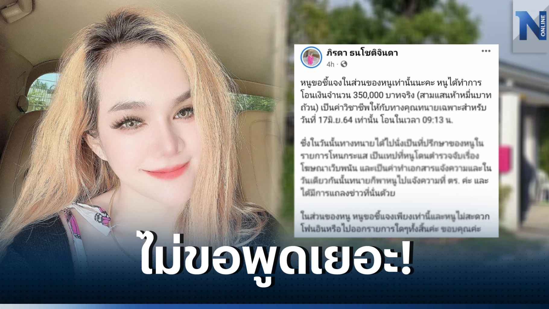 หนูขอชี้แจงในส่วนของหนูเท่านั้นนะคะ หนูได้ทำการโอนเงินจำนวน 350,000 บาทจริง (สามแสนห้าหมื่นบาทถ้วน) เป็นค่าวิชาชีพให้กับทางคุณทนายเฉพาะสำหรับวันที่ 17มิ.ย.64 เท่านั้น โอนในเวลา 09:13 น.