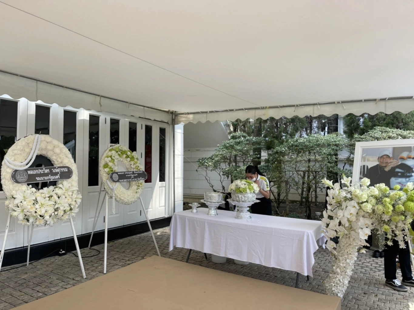 ส่วนบริเวณทางขึ้นบันไดหน้าบ้าน ได้มีการจัดจุดรดน้ำศพ 2 จุด โดยใช้สายโยงมาเพื่อให้ประชาชนทั่วไปที่ทาร่วมไว้อาลัยได้ร่วมพิธี ซึ่งจะเปิดให้เข้าครั้งละ 20-30 คน เพื่อไม่ให้เกิดความวุ่นวาย ขณะที่บริเวณลานหน้าบ้านมีประชาชนทยอยกันมารอร่วมพิธีอย่างต่อเนื่อง โดยได้จัดเก้าอี้ไว้รองรับกว่า 3,000 ตัว