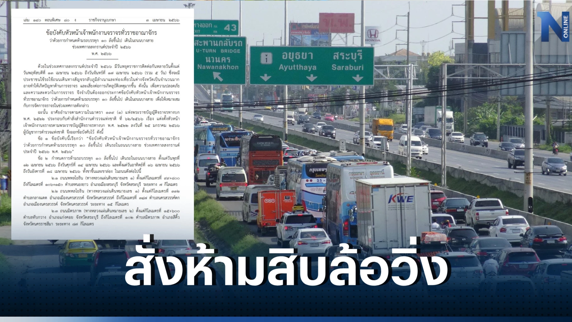 ข้อ 2.กำหนดการห้ามรถบรรทุก 10 ล้อขึ้นไป เดินรถในถนนบางสาย ตั้งแต่วันพุธที่ 12 เมษายน 2566 ถึงวันศุกร์ที่ 14 เมษายน 2566 และตั้งแต่วันอาทิตย์ที่ 16 เมษายน 2566 ถึงวันอังคารที่ 18 เมษายน 2566 ทั้งขาขึ้นและขาล่อง ในถนนดังต่อไปนี้ ได้แก่