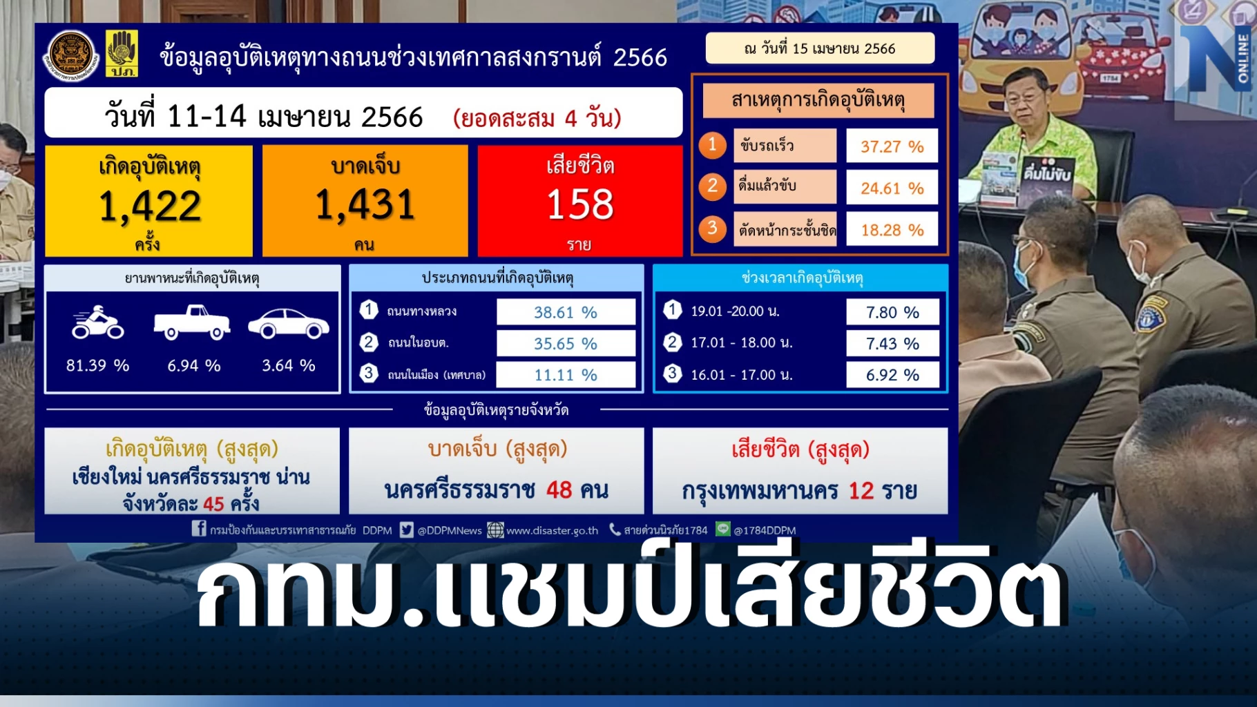 สรุปสถิติอุบัติเหตุทางถนนสะสม 4 วัน (วันที่ 11 – 14 เมษายน 2566) เกิดอุบัติเหตุรวม 1,422 ครั้ง ผู้เสียชีวิต 158 ราย ผู้บาดเจ็บ 1,431 คน โดยจังหวัดที่เกิดอุบัติเหตุสะสมสูงสุด ได้แก่ เชียงใหม่ นครศรีธรรมราช และน่าน (จังหวัดละ 45 ครั้ง) จังหวัดที่มีผู้เสียชีวิตสะสมสูงสุด ได้แก่ กรุงเทพมหานคร (12 ราย) และจังหวัดที่มีผู้บาดเจ็บสะสมสูงสุด ได้แก่ นครศรีธรรมราช (48 คน) จังหวัดที่ไม่มีผู้เสียชีวิต 12 จังหวัด