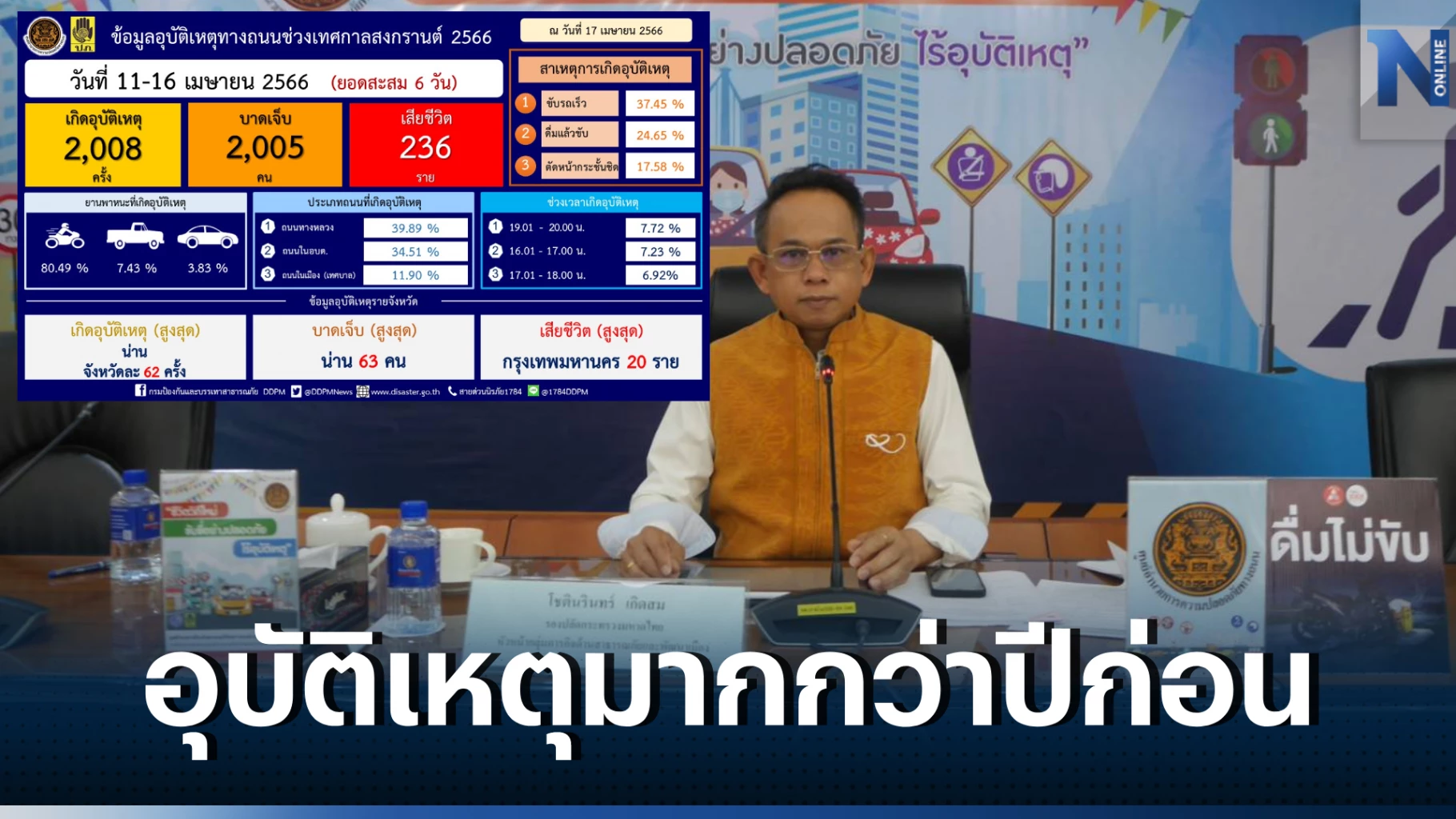 สรุปสถิติอุบัติเหตุทางถนนสะสม 6 วัน (วันที่ 11 – 16 เมษายน 2566) เกิดอุบัติเหตุรวม 2,008 ครั้ง ผู้เสียชีวิต 236 ราย ผู้บาดเจ็บ 2,005 คน โดยจังหวัดที่เกิดอุบัติเหตุสะสมสูงสุด ได้แก่ น่าน (62 ครั้ง) จังหวัดที่มีผู้เสียชีวิตสะสมสูงสุด ได้แก่ กรุงเทพมหานคร (20 ราย) และจังหวัดที่มีผู้บาดเจ็บสะสมสูงสุด ได้แก่ น่าน (63 คน) จังหวัดที่ไม่มีผู้เสียชีวิต 2 จังหวัด