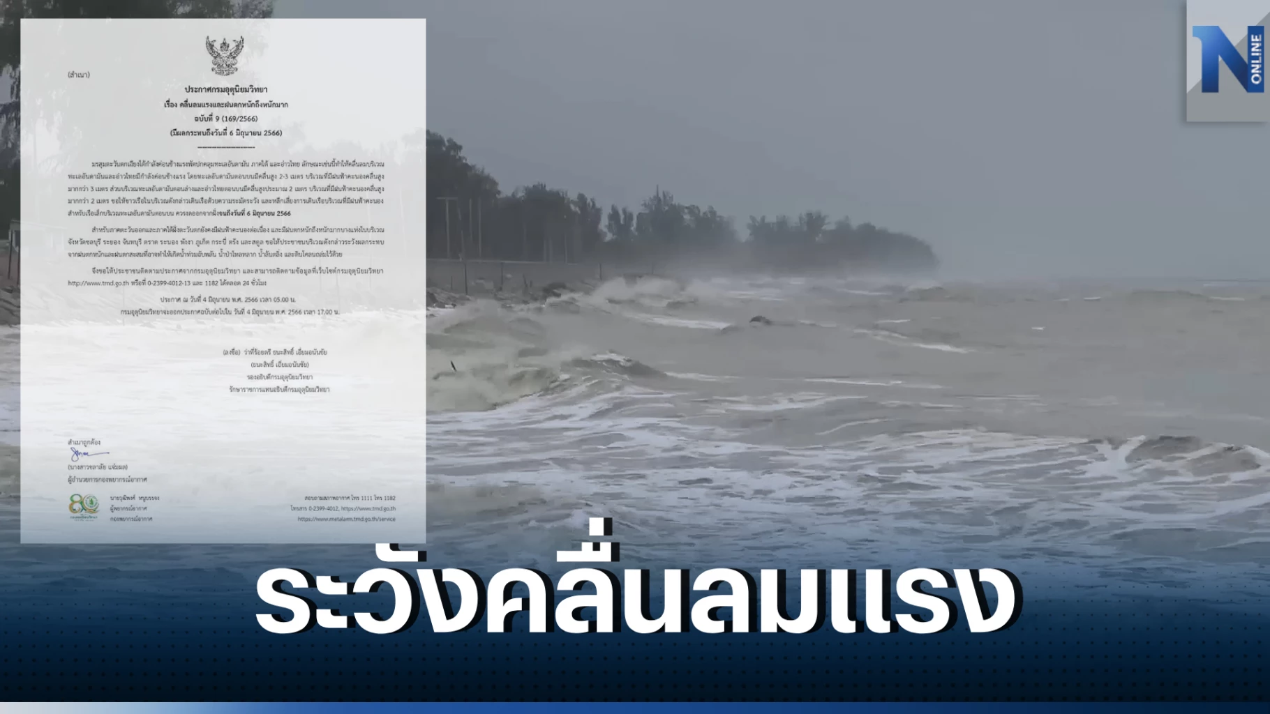 4 มิถุนายน 2566 เมื่อเวลา 05.00 น. กรมอุตุนิยมวิทยา ออกประกาศกรมอุตุนิยมวิทยา ฉบับที่ 9 (169/2566) เรื่อง คลื่นลมแรงและฝนตกหนักถึงหนักมาก (มีผลกระทบถึงวันที่ 6 มิถุนายน 2566)