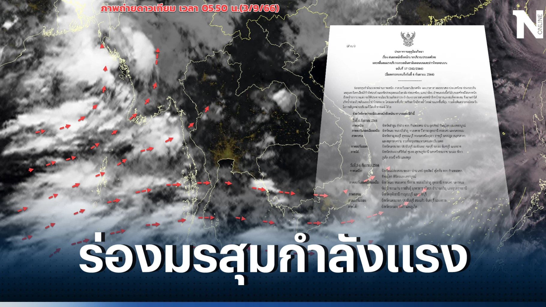 4 กันยายน 2566 พยากรณ์อากาศวันนี้ “ร่องมรสุมกำลังแรง” รับมือ “ฝนตกหนักถึงหนักมาก” กรมอุตุนิยมวิทยา ว่าที่ร้อยตรี ธนะสิทธิ์ เอี่ยมอนันชัย รองอธิบดีกรมอุตุนิยมวิทยา รักษาราชการแทนอธิบดีกรมอุตุนิยมวิทยา ลงนามในประกาศกรมอุตุนิยมวิทยา ฉบับที่ 17 (242/2566) เรื่อง ฝนตกหนักถึงหนักมากบริเวณประเทศไทย และคลื่นลมแรงบริเวณทะเลอันดามันตอนบนและอ่าวไทยตอนบน มีผลกระทบจนถึงวันที่ 6 กันยายน 2566 ระบุว่า..