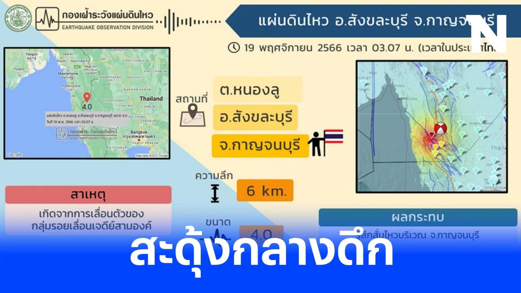 ล่าสุด นางสาวกรรวี สิทธิชีวภาค อธิบดีกรมอุตุนิยมวิทยา ได้ประกาศกรมอุตุนิยมวิทยา เรื่องแผ่นดินไหวที่ ต.หนองลู อ.สังขละบุรี จ.กาญจนบุรี ระบุว่า เมื่อวันที่ 19 พ.ย. พ.ศ.2566 เวลา 03.07 น.เกิดแผ่นดินไหวจุดศูนย์กลางอยู่บริเวณ ต.หนองลู อ.สังขละบุรี จ.กาญจนบุรี ที่ละติจูด 15.185 องศาเหนือ ลองติจูด 98.404 องศาตะวันออก ขนาด 4.0 ความลึก 6 กิโลเมตร ได้รับแจ้งรู้สึกสั่นไหวบริเวณ จ.กาญจนบุรี หากมีรายละเอียดเพิ่มเติมจะแจ้งให้ทราบโดยด่วนต่อไป