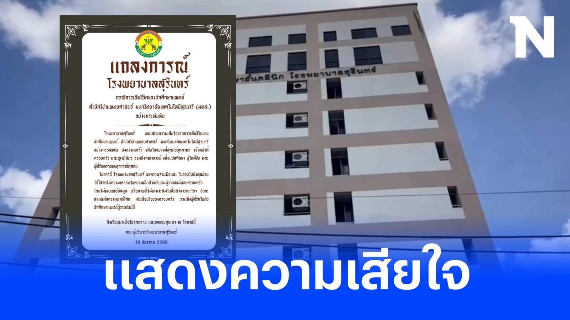 16 ธันวาคม 2566 โรงพยาบาลสุรินทร์ ได้ออกแถลงการณ์ ว่า โรงพยาบาลสุรินทร์ ขอแสดงความเสียใจจากการเสียชีวิตของนักศึกษาแพทย์ สำนักวิชาแพทยศาสตร์ มหาวิทยาสัยเทคโนโลยีสุรนารี อย่างกะทันหัน ยังความเศร้า เสียใจอย่างที่สุดต่อบุคลากร เจ้าหน้าที่ ครอบครัวและญาติมิตร รวมถึงคณาจารย์ เพื่อนนักศึกษา ผู้ใกล้ชิด และผู้ที่ทราบเหตุการณ์ทุกคน