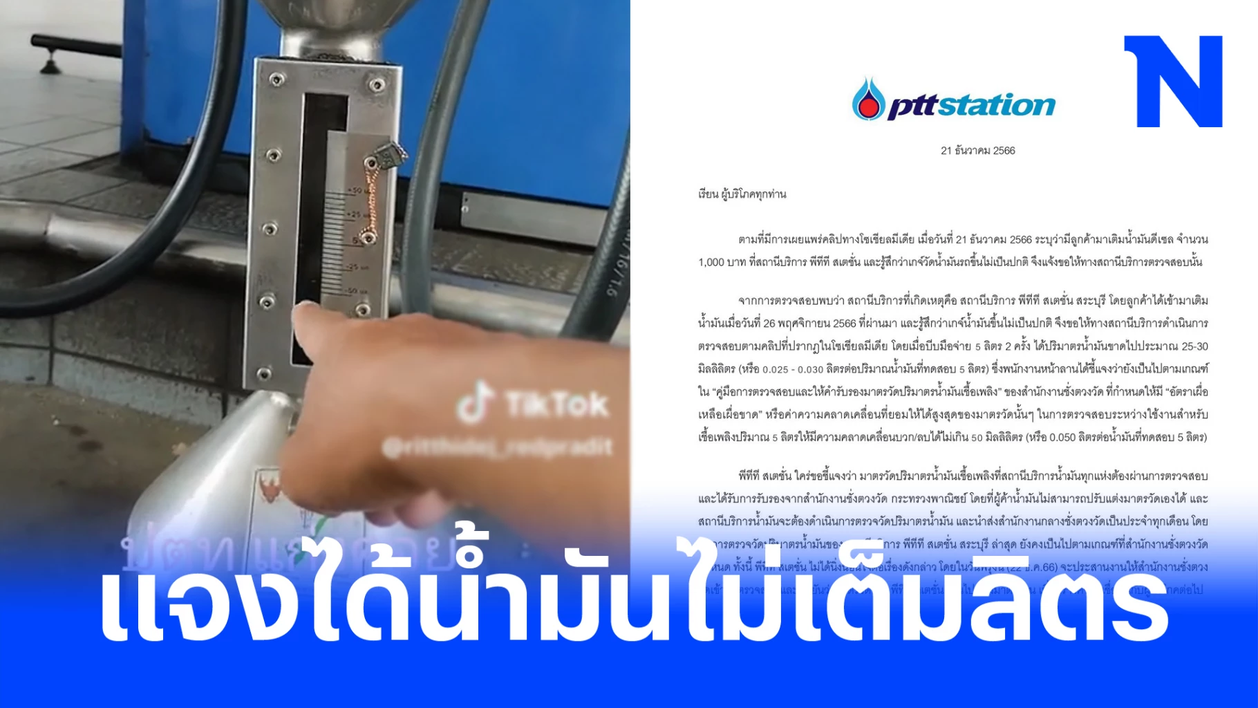 จากการตรวจสอบพบว่า สถานีบริการที่เกิดเหตุคือ สถานีบริการ พีทีที สเตชั่น สระบุรี โดยลูกค้าได้เช้ามาเติมน้ำมันเมื่อวันที่ 26 พฤศจิกายน 2566 ที่ผ่านมา และรู้สึกว่าเกจ์น้ำมันขึ้นไม่เป็นปกติ จึงขอให้ทางสถานีบริการดำเนินการตรวจสอบตามคลิปที่ปรากฎในโซเชียลมีเดีย โดยเมื่อบีบมือจ่าย 5 ลิตร 2 ครั้ง ได้ปริมาตรน้ำมันขาดไปประมาณ 25-30 มิลลิลิตร (หรือ .025 - 0.03 ลิตรต่อปริมาณน้ำมันที่ทดสอบ ลิตร ซึ่งพนักงานหน้าลานได้ชี้แจงว่ายังเป็นไปตามเกณฑ์ใน "คู่มือการตรวจสอบและให้คำรับรองมาตรวัดปริมาตรน้ำมันเชื้อเพลิง" ของสำนักงานชั่งตวงวัด ที่กำหนดให้มี "อัตราเผื่อเหลือเผื่อขาด" หรือค่าความคลาดเคลื่อนที่ยอมให้ได้สูงสุดของมาตรวัดนั้นๆ ในการตรวจสอบระหว่างใช้งานสำหรับเชื้อเพลิงปริมาณ 5 ลิตรให้มีความคลาดเคลื่อนบวก/ลบได้ไม่เกิน 50 มิลลิลิตร (หรือ 0.050 ลิตรต่อน้ำมันที่ทดสอบ 5 ลิตร)