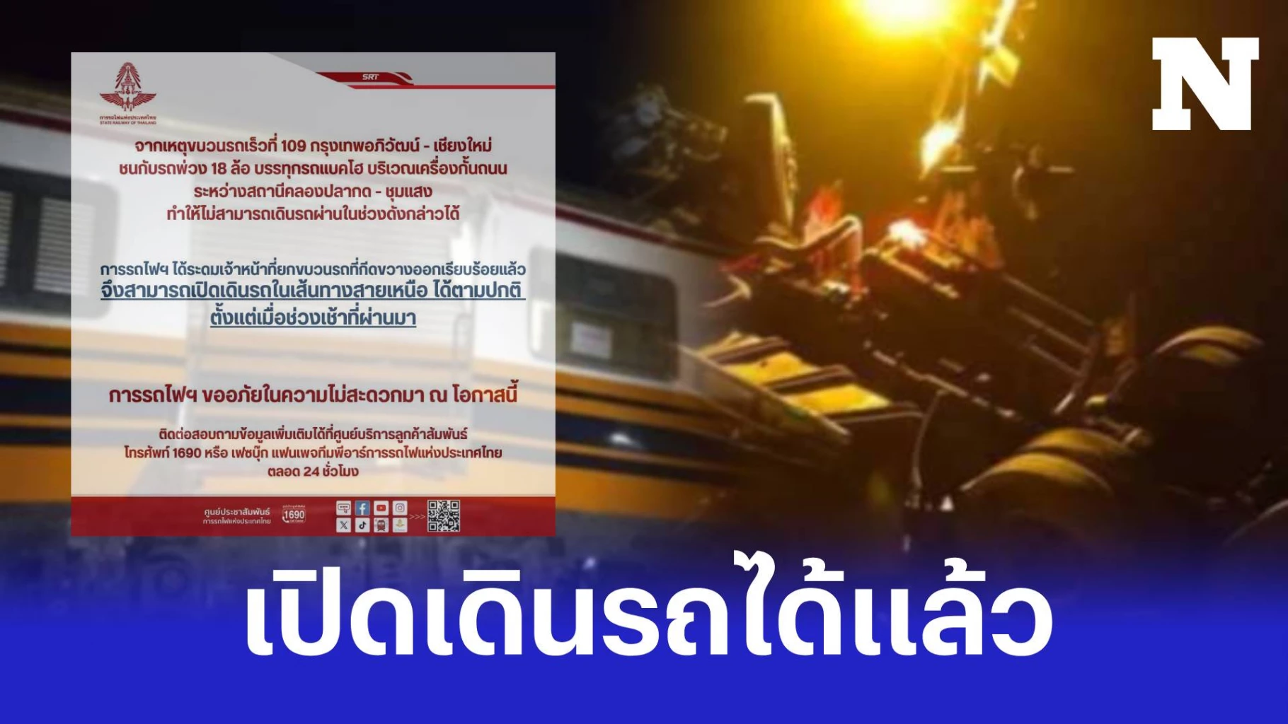 จากการระดมเจ้าหน้าที่รถไฟและอุปกรณ์ต่างๆ ลงพื้นที่เพื่อเร่งดำเนินการตลอดทั้งคืนที่ผ่านมา ขณะนี้สามารถดำเนินการยกหัวรถจักรที่ตกราง และตรวจสอบสภาพทางเรียบร้อยแล้ว เมื่อเวลา 06.00 น. ทำให้สามารถเปิดการเดินรถในเส้นทางสายเหนือ ช่วงระหว่างสถานีคลองปลากด - ชุมแสง อ.ชุมแสง จ.นครสวรรค์ ได้ตามปกติตั้งแต่ช่วงเช้าที่ผ่านมา การรถไฟฯ ขออภัยในความไม่สะดวกมา ณ โอกาสนี้
