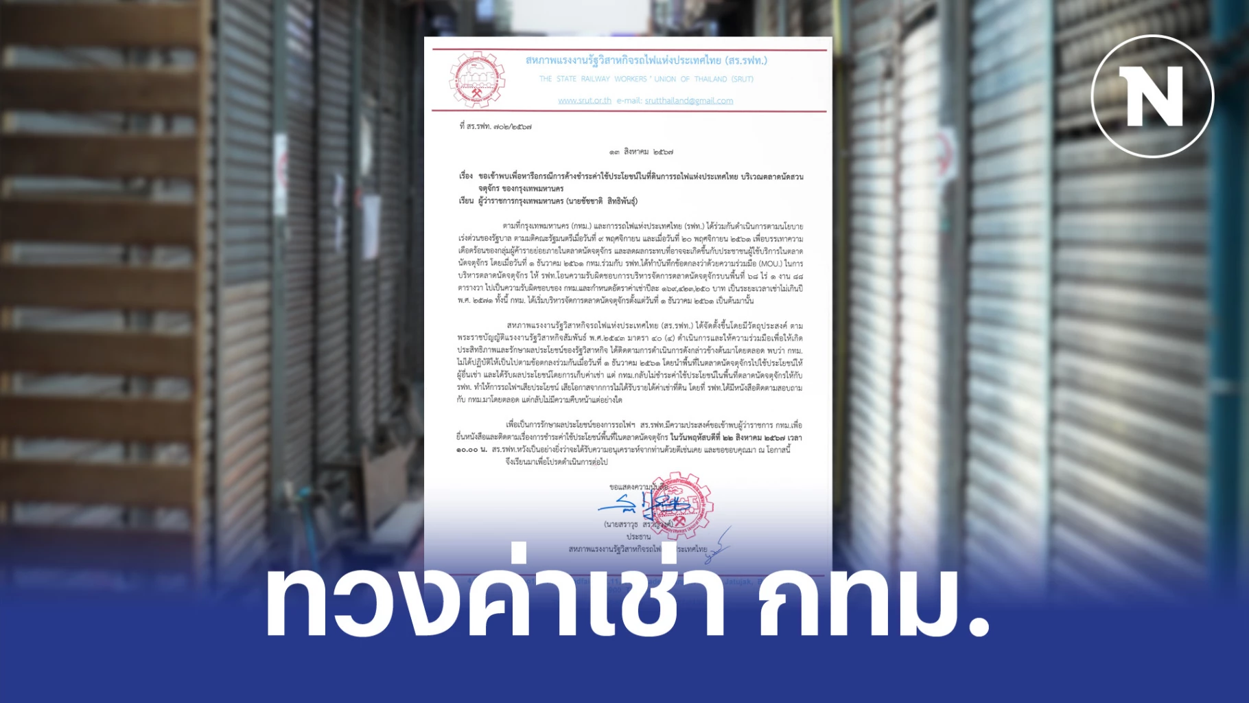 สหภาพแรงงานรัฐวิสาหกิจรถไฟแห่งประเทศไทย (สร.รฟท.) ได้จัดตั้งขึ้นโดยมีวัตถุประสงค์ ตามพระราชบัญญัติแรงงานรัฐวิสาหกิจสัมพันธ์ พ.ศ.2543 มาตรา 40 (4) ดำเนินการและให้ความร่วมมือเพื่อให้เกิดประสิทธิภาพและรักษาผลประโยชน์ของรัฐวิสาหกิจ ได้ติดตามการดำเนินการดังกล่าวข้างต้นมาโดยตลอด พบว่า กทม.ไม่ได้ปฏิบัติให้เป็นไปตามข้อตกลงร่วมกันเมื่อวันที่ 1 ธันวาคม 2561 โดยนำพื้นที่ในตลาดนัดจดจตุจักรไปใช้ประโยชน์ให้ผู้อื่นเช่า และได้รับผลประโยชน์โดยการเก็บค่าเช่า แต่ กทม.กลับไม่ชำระค่าใช้ประโยชน์ในพื้นที่ตลาดนัดจตุจักรให้กับ รฟท. ทำให้การรถไฟฯเสียประโยชน์ เสียโอกาส จากการไม่ได้รับรายได้ค่าเช่าที่ดิน โดยที่ รฟท.ได้มีหนังสือติดตามสอบถามกับ กทม.มาโดยตลอด แต่กลับไม่มีความคืบหน้าแต่อย่างใด