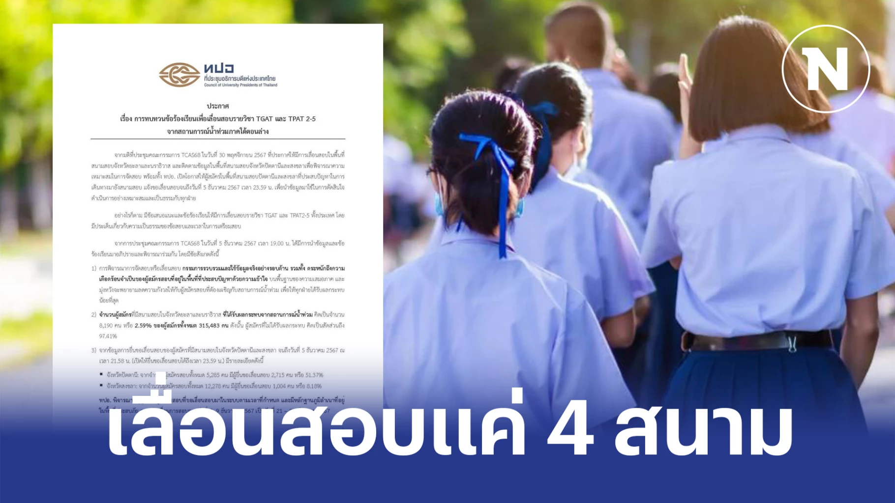 พร้อมทั้ง ทปอ. เปิดโอกาสให้ผู้มัครในพื้นที่สนามสอบปัตตานีและสงขลา ที่ประสบปัญหาในการเดินทางมายังสนามสอบ แจ้งขอเลื่อนสอบจนถึงวันที่ 5 ธันวาคม 2567 เวลา 23.59 น. เพื่อนำข้อมูลมาใช้ในการตัดสินใจดำเนินการอย่างเหมาะสมและเป็นธรรมกับทุกฝ่าย