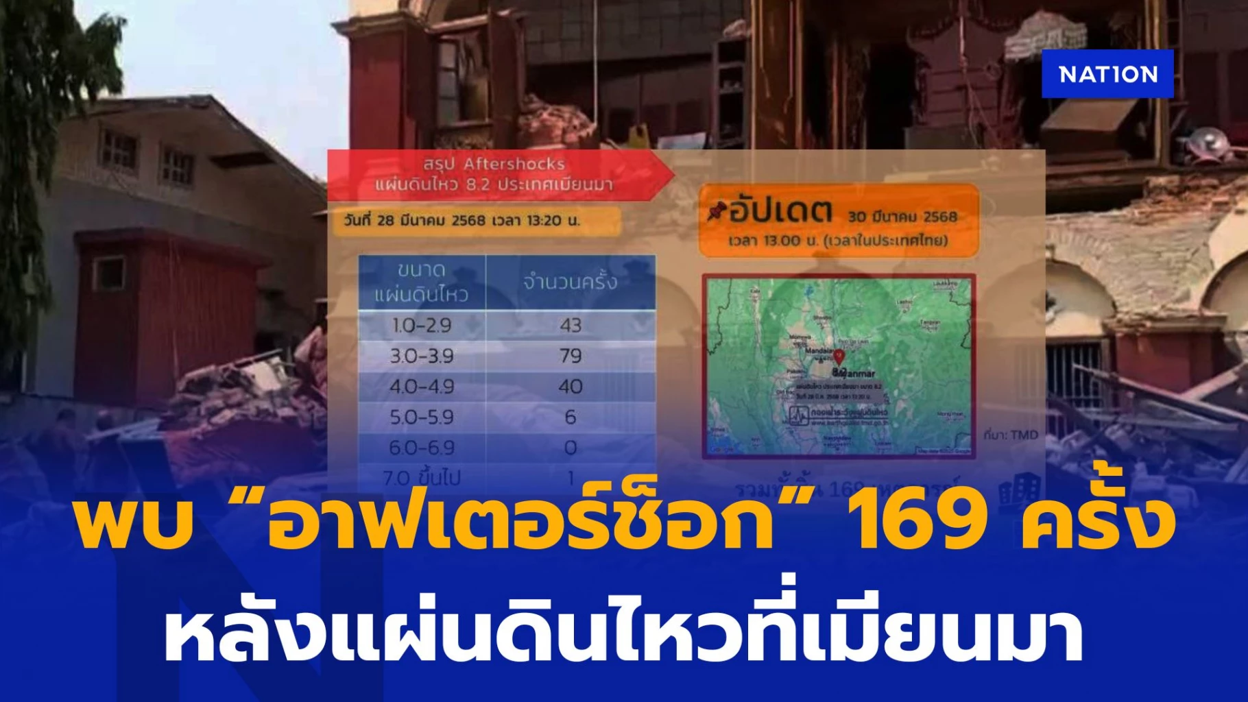 30 มีนาคม 2568 เว็บไซต์ “กองเฝ้าระวังแผ่นดินไหว กรมอุตุนิยมวิทยา” รายงานความคืบหน้าหลังเกิดแผ่นดินไหวเมียนมา เมื่อวันที่ 28 มี.ค.68 จนถึง 30 มี.ค. 68 เวลา 13.00 น. พบอาฟเตอร์ช็อกเกิดขึ้นแล้ว 169 ครั้ง