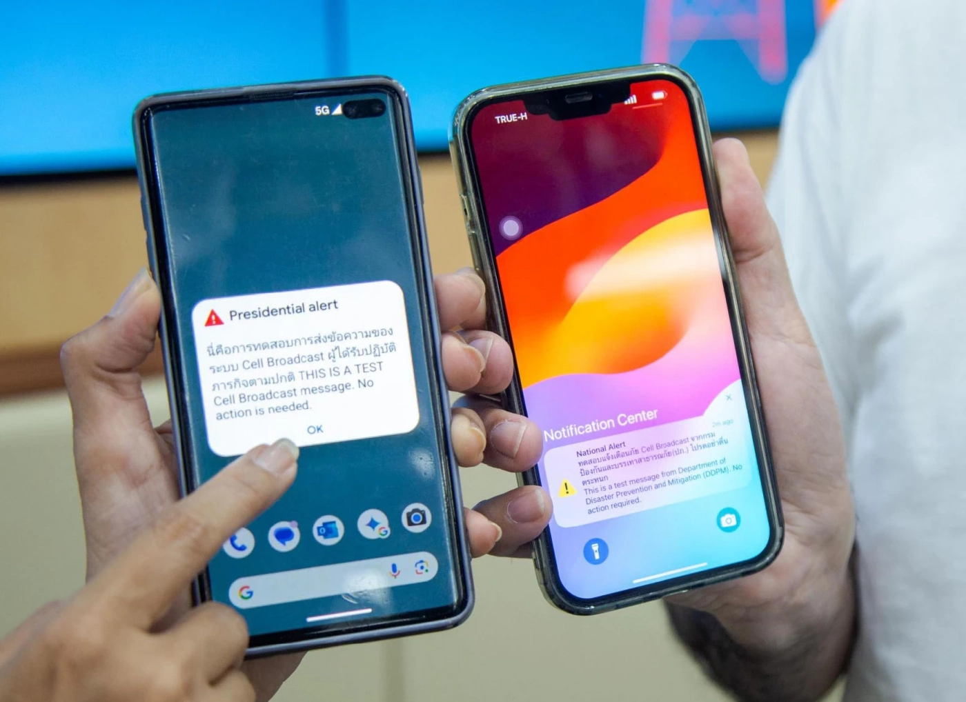 ด้าน นายจักรกฤษณ์ อุไรรัตน์ หัวหน้าคณะผู้บริหารด้านกิจการองค์กร บริษัท ทรู คอร์ปอเรชั่น จำกัด (มหาชน) เปิดเผยว่า ทรู คอร์ปอเรชั่น ในฐานะผู้ให้บริการโทรคมนาคมที่มุ่งมั่นพัฒนาโครงสร้างพื้นฐานด้านความปลอดภัยให้กับประชาชนและนักท่องเที่ยวต่างชาติในประเทศไทย มีความพร้อมเปิดใช้งาน Cell Broadcast Service (CBS) แล้ววันนี้ ทั้งในรูปแบบปกติและแบบ Virtual โดยได้ติดตั้งระบบ CBS ครอบคลุมทุกสถานีฐาน 4G และ 5G ทั่วประเทศเรียบร้อยแล้ว สามารถทำงานได้เต็มประสิทธิภาพตามระเบียบปฏิบัติประจำ (SOP) ที่ทุกหน่วยงานกำหนดร่วมกัน ทั้งนี้ เราพร้อมสนับสนุน ปภ. ทดสอบระบบแบบเต็มรูปแบบทั้ง 3 ระดับ ได้แก่ ระดับเล็ก ระดับกลาง และระดับใหญ่ ครอบคลุมพื้นที่ตัวแทนทั่วทุกภูมิภาคของประเทศ