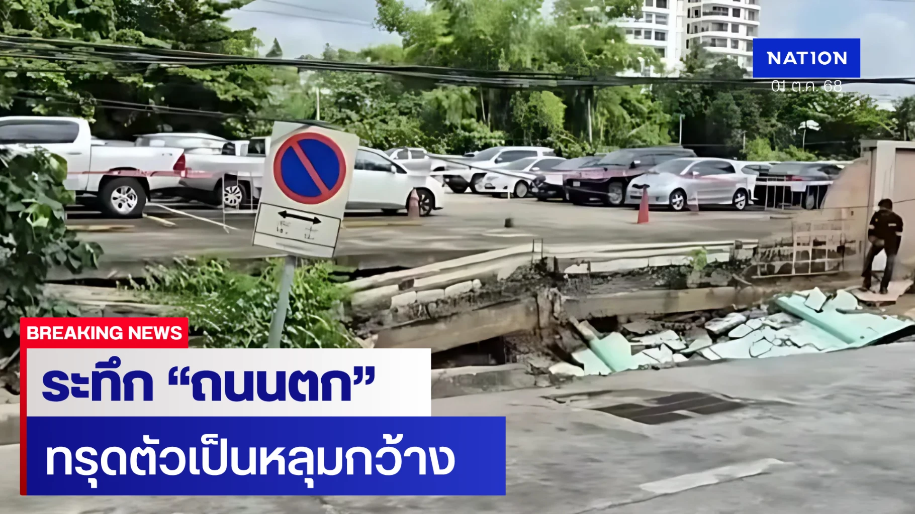 มีรายงานว่า เมื่อคืนวันจันทร์ 29 ก.ย.2568 ที่ผ่านมา บริเวณดังกล่าวซึ่งอยู่ห่างจากแยกถนนตก ประมาณ 600 เมตร ได้มีน้ำเอ่อ ขึ้นมาบนผิวจราจรก่อนที่จะเกิดการทรุดตัวในวันนี้(1 ต.ค. 2568)