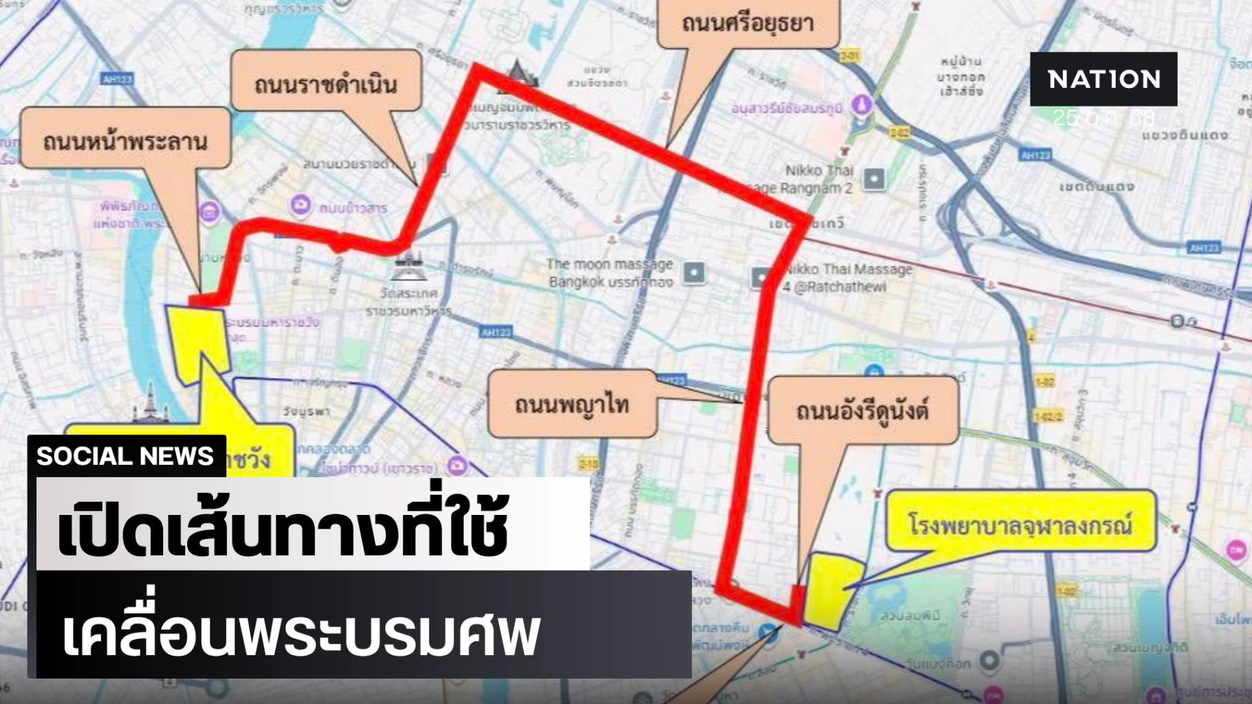 มีรายงานว่า จะมีการเคลื่อนย้ายพระบรมศพ สมเด็จพระนางเจ้าสิริกิติ์ พระบรมราชินีนาถ พระบรมราชชนนีพันปีหลวง จากโรงพยาบาลจุฬาลงกรณ์ ไปยังพระที่นั่งดุสิตมหาปราสาท ในพระบรมมหาราชวัง ตามเส้นทางดังต่อไปนี้