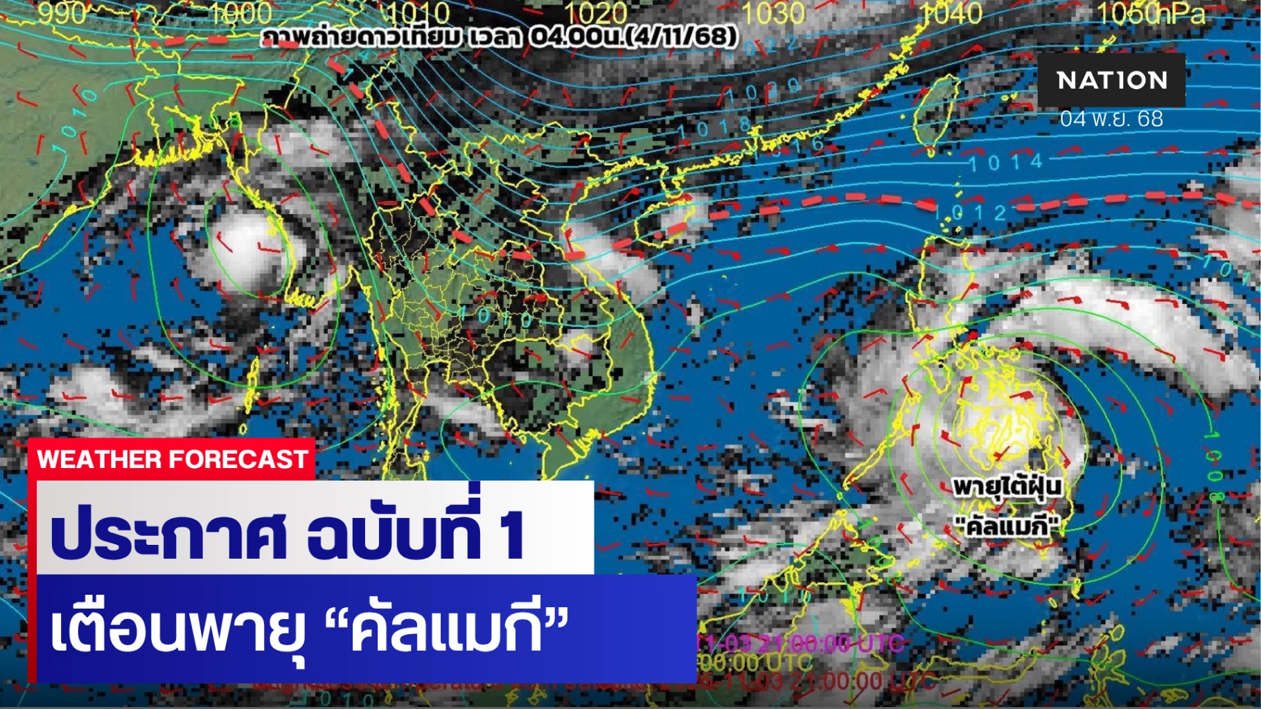 4 พฤศจิกายน 2568 เว็บไซต์กรมอุตุนิยมวิทยา เผยแพร่ ประกาศกรมอุตุนิยมวิทยา เรื่อง พายุ “คัลแมกี” และฝนตกหนักถึงหนักมากบริเวณประเทศไทย ฉบับที่ 1 (321/2568) ระบุว่า เมื่อเวลา 16.00 น. ของวันนี้ (4 พ.ย. 68) พายุไต้ฝุ่น “คัลแมกี” (KALMAEGI) บริเวณประเทศฟิลิปปินส์ ได้เคลื่อนลงสู่ทะเลจีนใต้แล้ว โดยมีศูนย์กลางอยู่ที่ละติจูด 10.3 องศาเหนือ ลองจิจูด 121.3 องศาตะวันออก ความเร็วลมสูงสุดใกล้ศูนย์กลางประมาณ 120 กิโลเมตรต่อชั่วโมง กำลังเคลื่อนตัวทางทิศตะวันตกค่อนทางเหนือเล็กน้อย ด้วยความเร็วประมาณ 20 กิโลเมตรต่อชั่วโมง พายุนี้คาดว่าจะเคลื่อนขึ้นฝั่งบริเวณประเทศเวียดนามตอนกลางในช่วงวันที่ 6-7 พ.ย. 68 หลังจากนั้นจะอ่อนกำลังลงเป็นพายุโซนร้อน และพายุดีเปรสชันตามลำดับ
