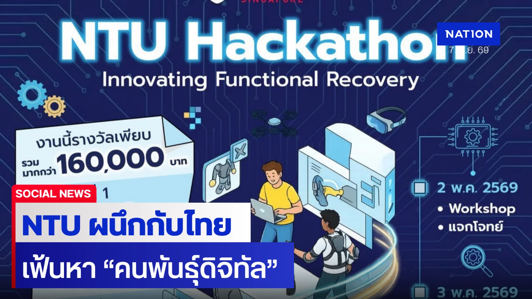 มหาวิทยาลัยเทคโนโลยีนันยาง (Nanyang Technological University NTU) ประเทศสิงคโปร์ สถาบันการศึกษาชั้นนำระดับโลกด้านวิศวกรรมและเทคโนโลยี ประกาศรุกคืบสร้างเครือข่ายนวัตกรรมในประเทศไทย ผ่านการจัดกิจกรรม "NTU Hackathon" ภายใต้หัวข้อ "Innovating Functional Recovery" หวังดึงนิสิต นักศึกษา และบุคคลทั่วไป ร่วมประชันไอเดียสร้างต้นแบบนวัตกรรมฟื้นฟูสมรรถภาพ ชิงเงินรางวัลรวมกว่า 1.6 แสนบาท พร้อมรับเกียรติบัตรรับรองจาก NTU โดยตรง